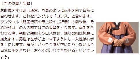 (韓国の拱手挨拶は、まず男の場合は左手を上に、女の場合は右手を上にして両手を包み込んで腹に位置させた後、腰を曲げて挨拶する。)