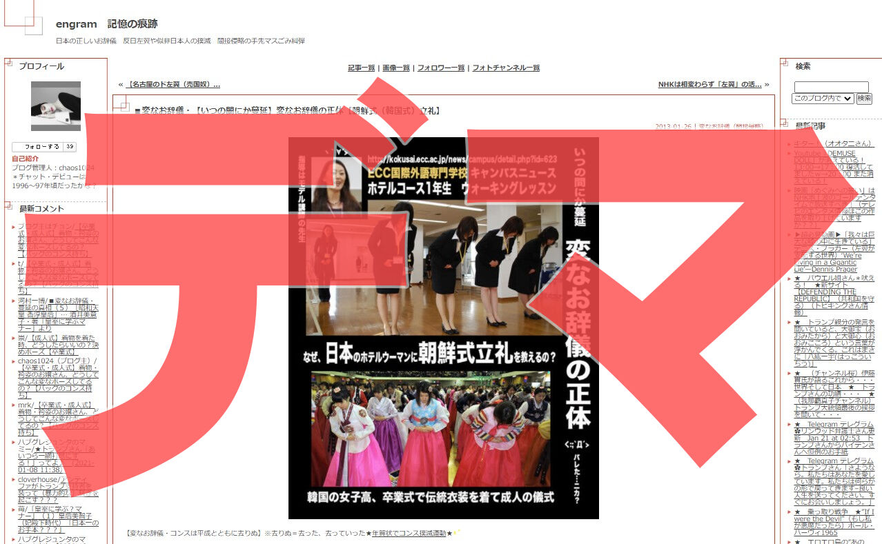 詳しくはこちらの記事に書いておいたのでお読みいただきたいですが、2013年1月26日に、『engram』という嫌韓サイトが「これは朝鮮式立礼だ」と記事にします。もちろんそこにも一言たりとも根拠は書かれておらず、単に「似ているお辞儀が韓国に存在する」というだけで「朝鮮式」認定をしたにすぎません。この記事以前には、そのお辞儀を朝鮮式だとする発言はツイッター上にも全く存在しません。
