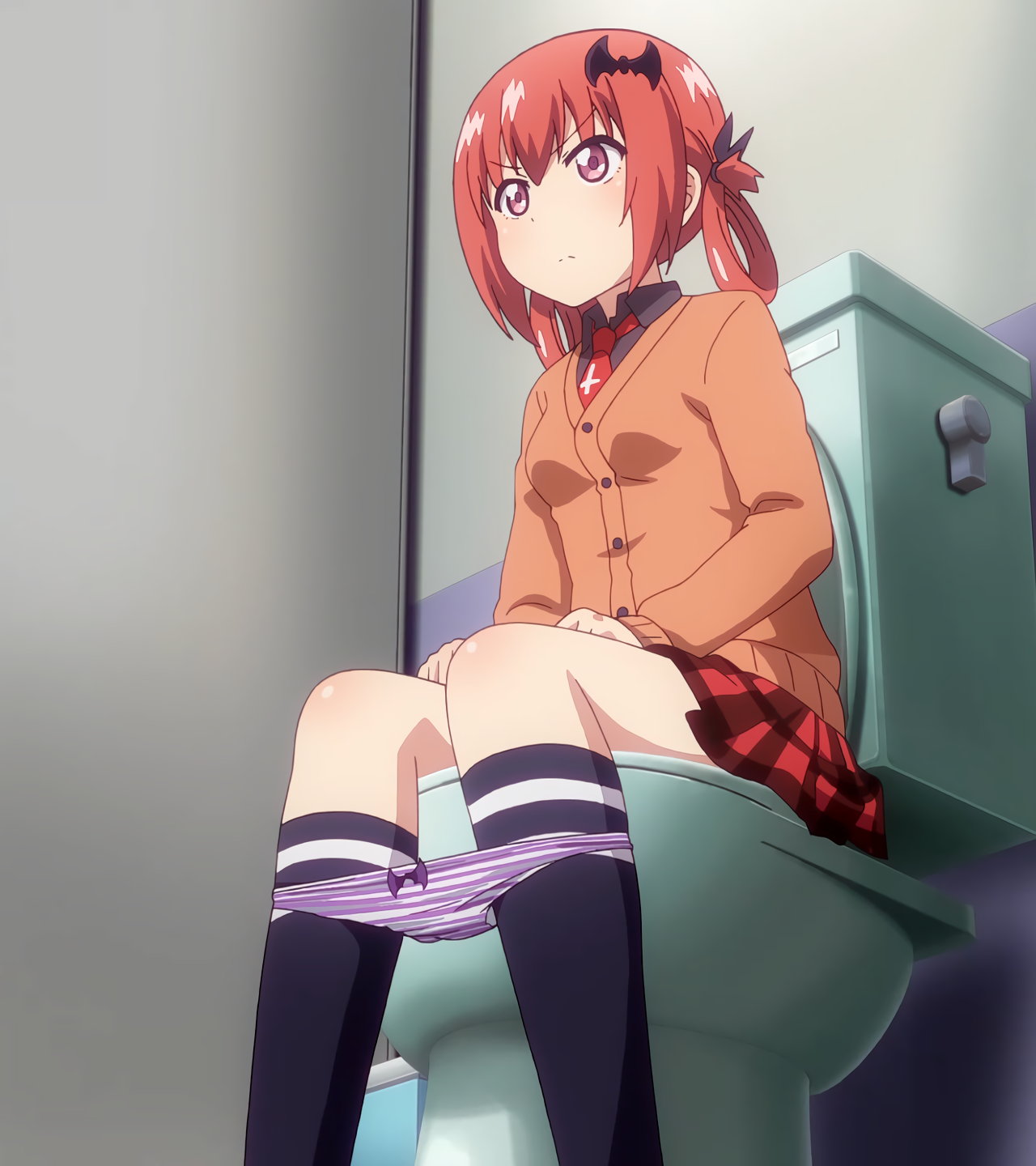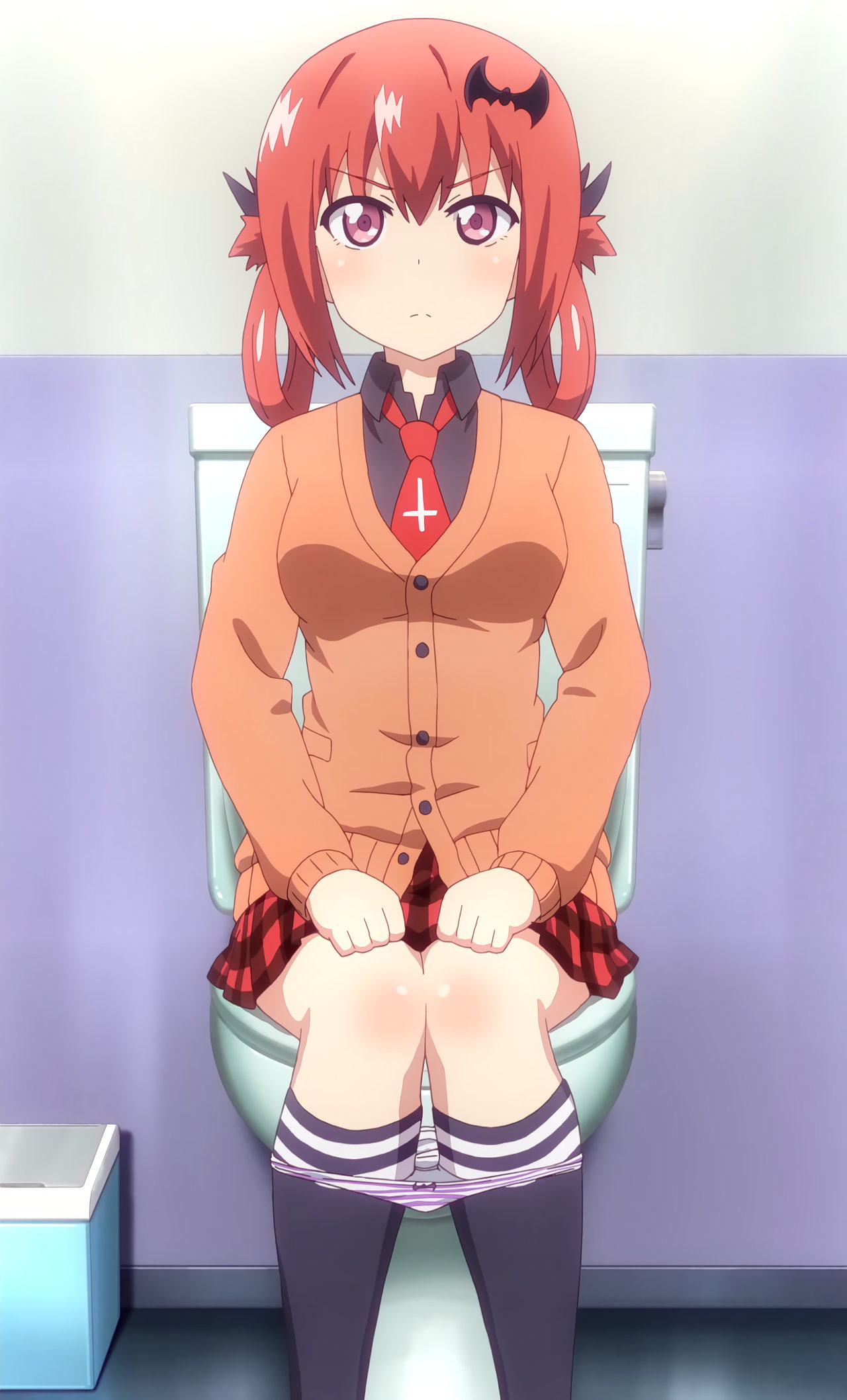 便器に座ってパンツを下ろし、排泄中のサターニャ。