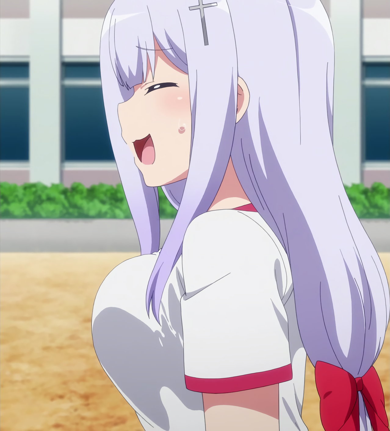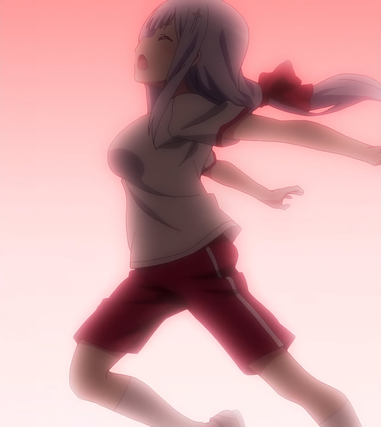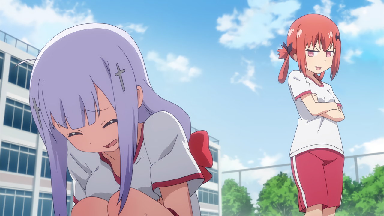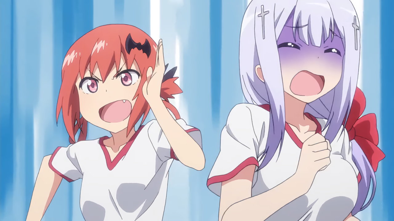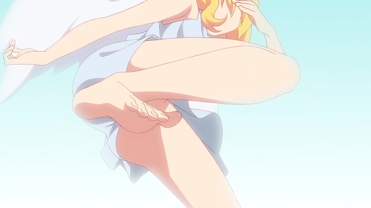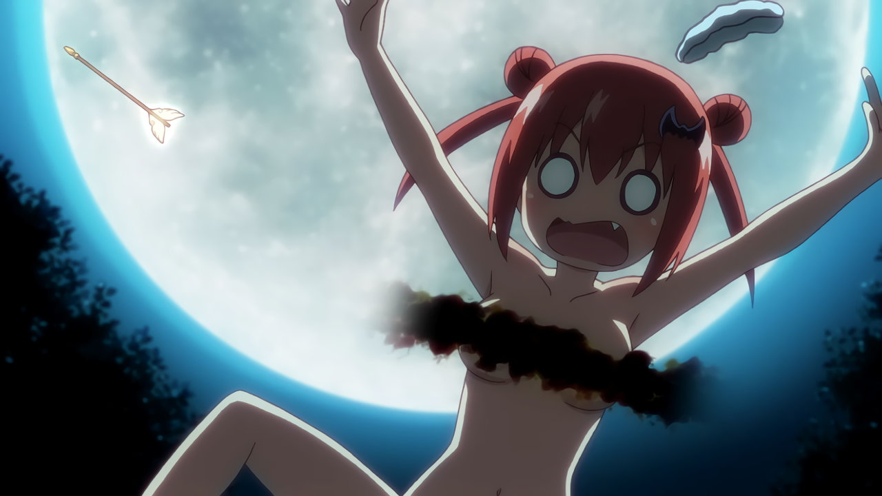 サターニャと競走中のラフィエル。途中でブラジャーが壊れ、悲鳴を上げる。