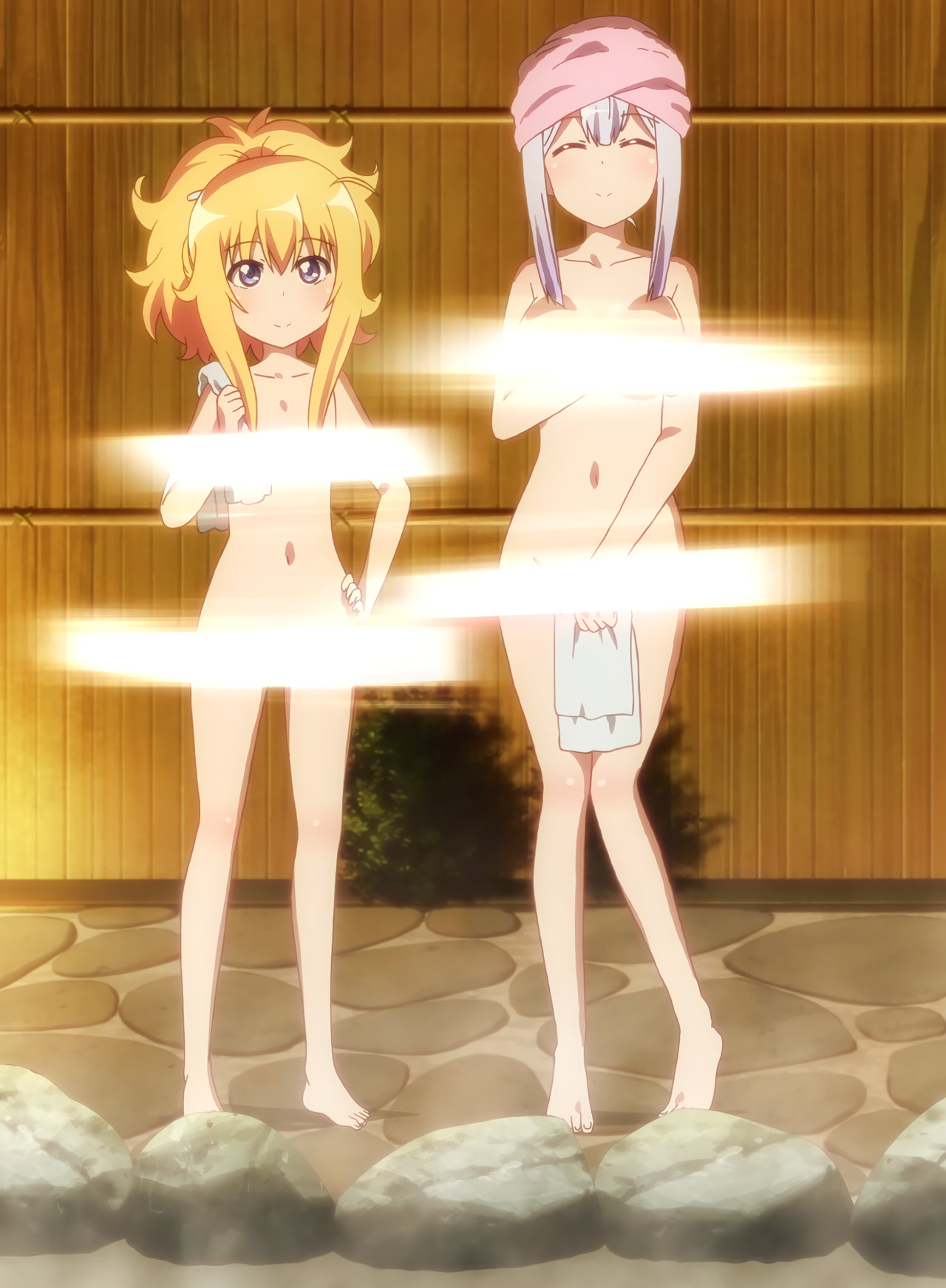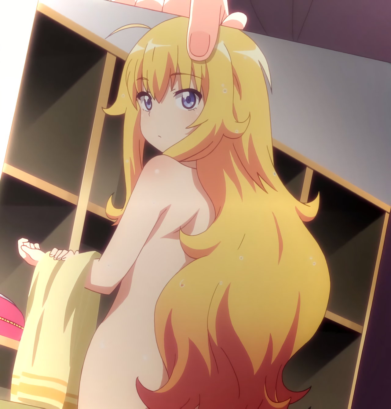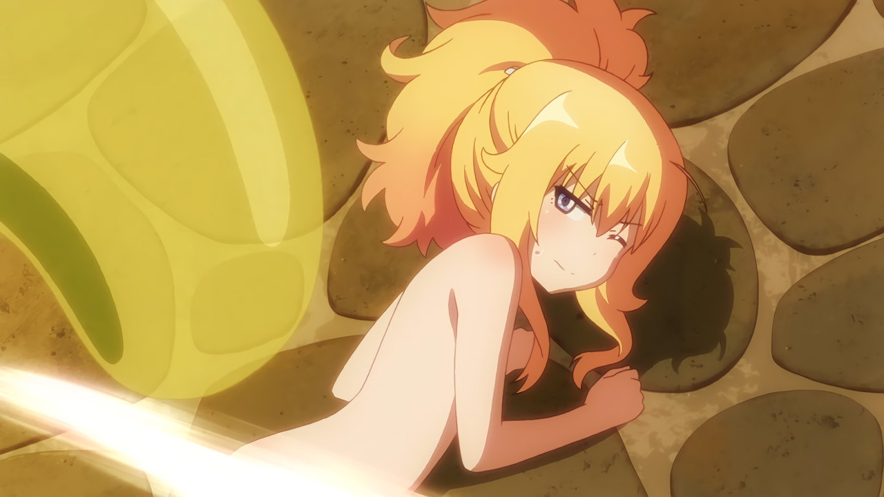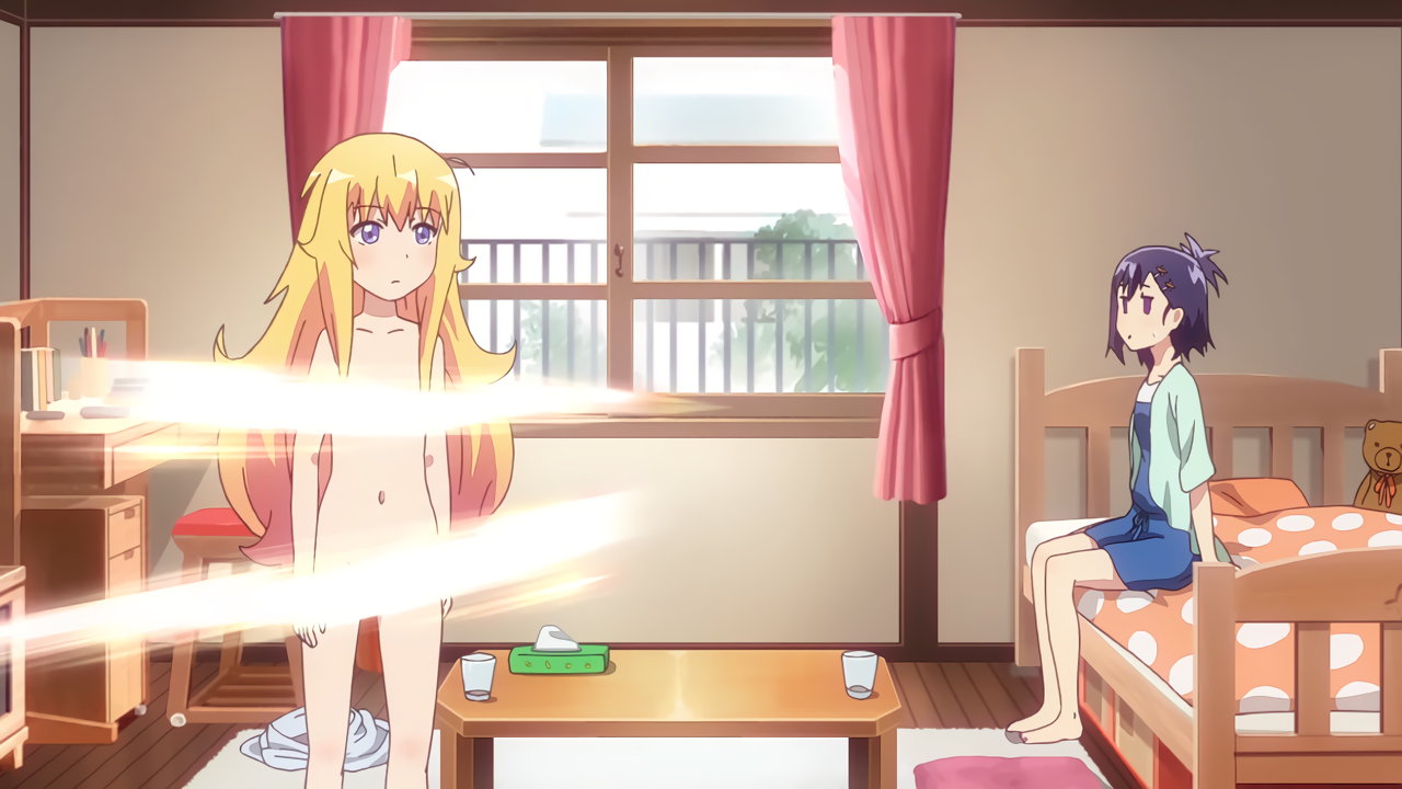 全裸になるガヴリール。胸と股間は、光で隠されている。