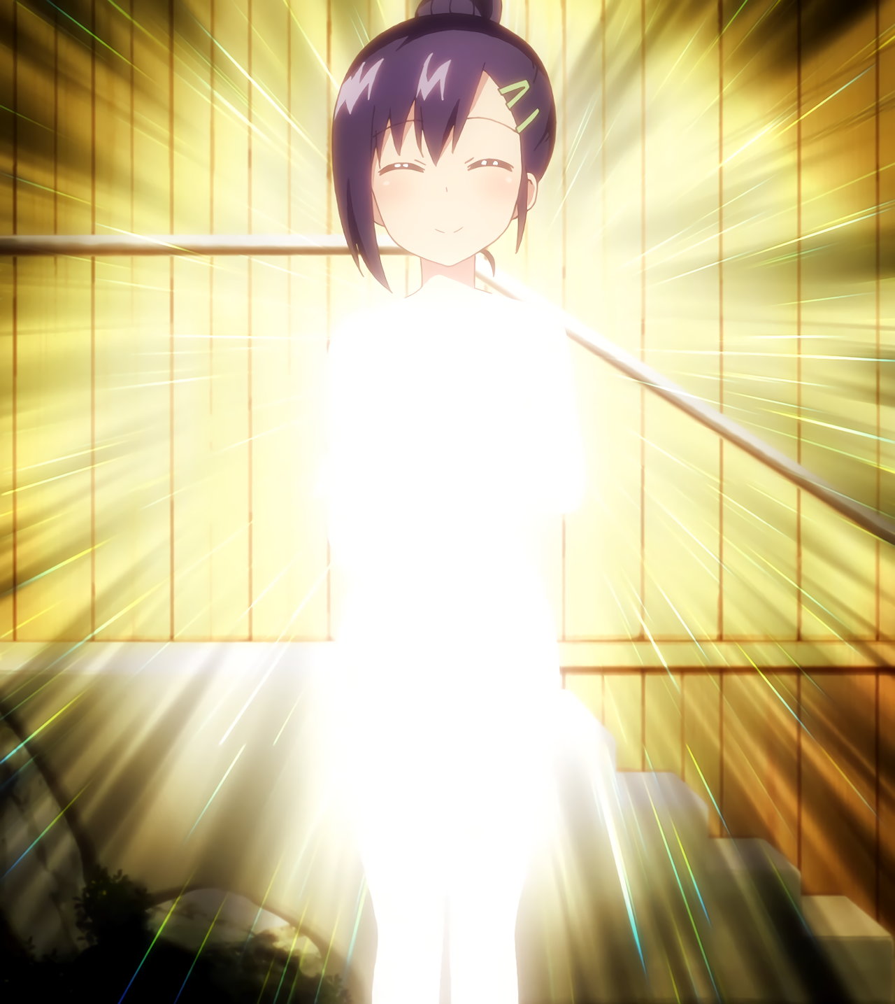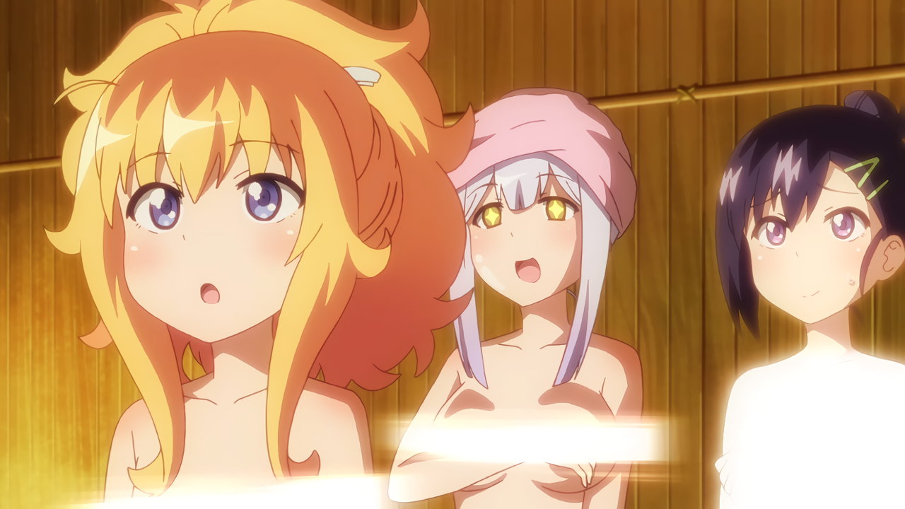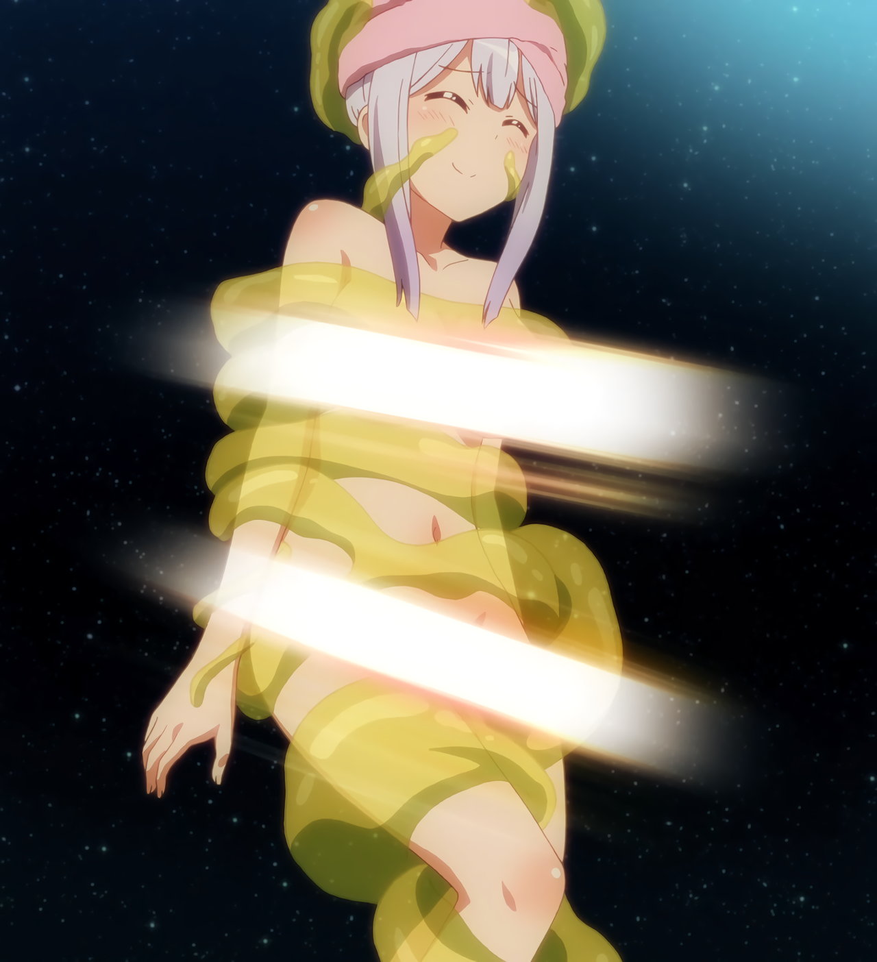 全裸になるガヴリール。胸と股間は、光で隠されている。