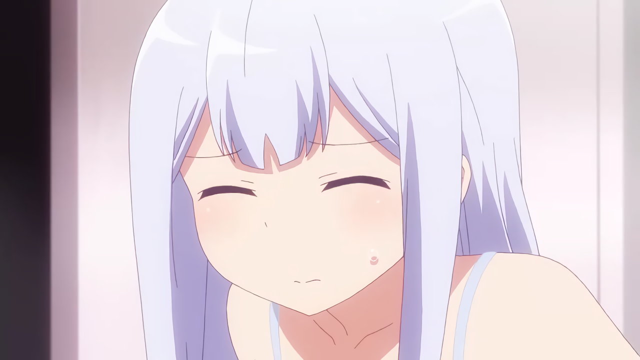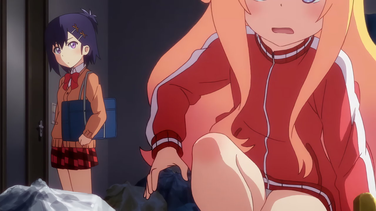 ジャージを上だけ着たガヴリール。生脚・パンチラを見せる。