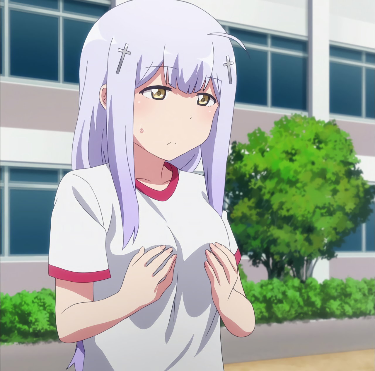 巨乳を手で支えつつ、登校するラフィエル。