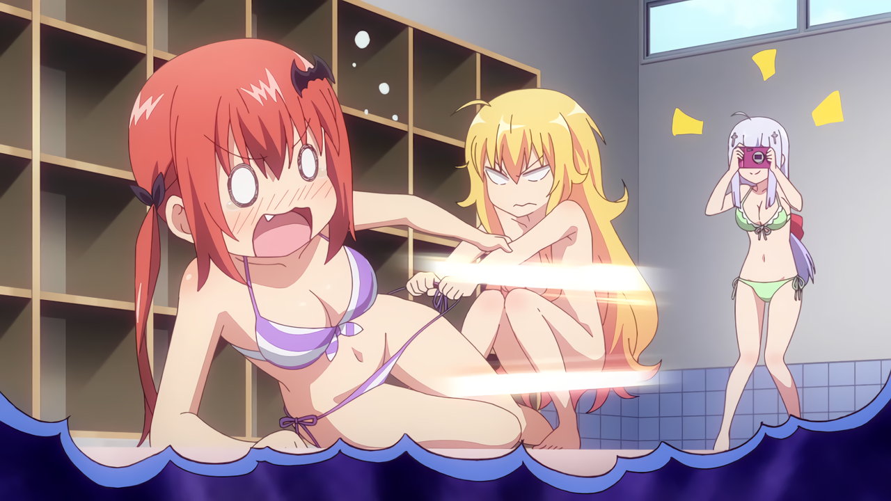 着替え中にキャットファイトを始める、サターニャとガヴリール。その様子を激写するラフィエル。