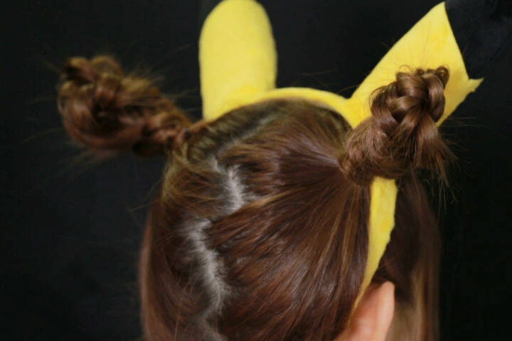高めの位置でツインテールを作りましょう。後頭部の分け目をジグザグにすると、「ピカチュウ」の象徴的な“稲妻”のモチーフを表現できます。