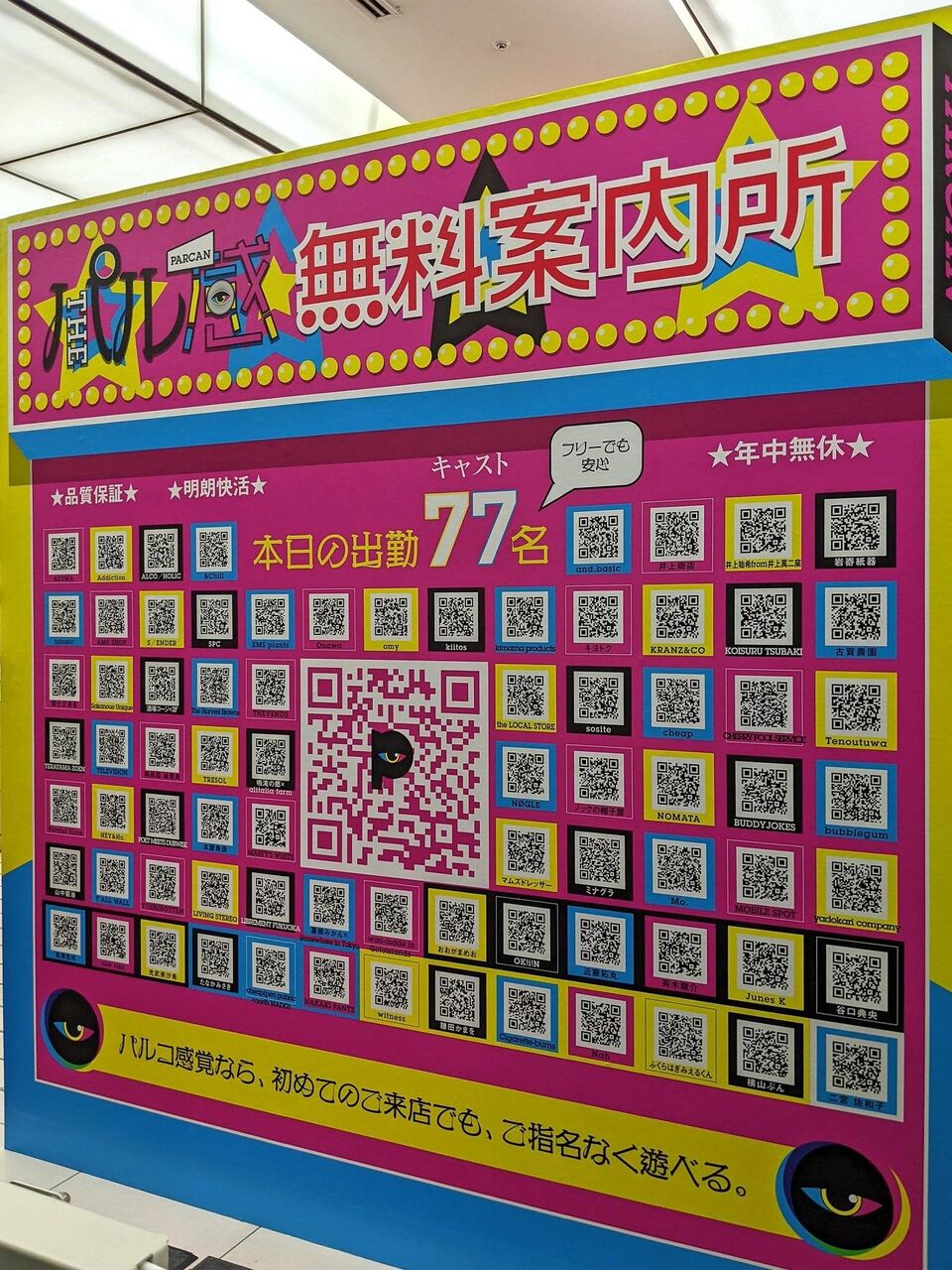「パルコ感覚」は九州のアート、ファッション、フードなどを発信するイベントで、開催期間は6月11~26日。問題となった「パル感無料案内所」は本館1階正面入り口に位置しており、歓楽街で風俗店を案内する「無料案内所」を想起させるデザインだった。そのため、来場者などから苦情が寄せられていた。