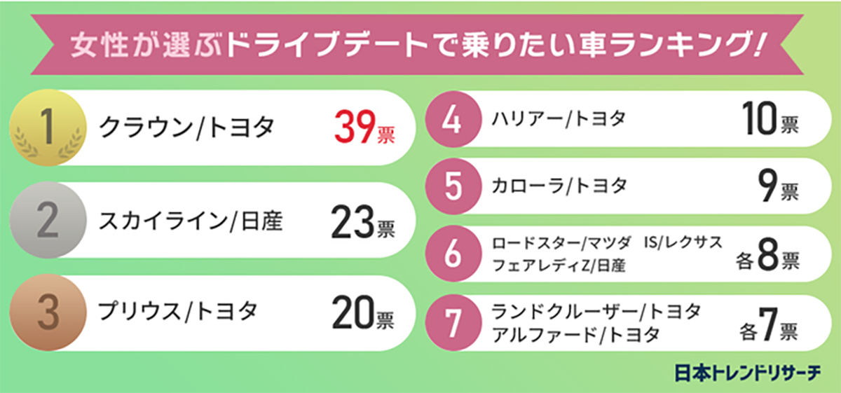 女性に、ドライブデートで乗りたい車について尋ねたところ、1位は「クラウン/トヨタ」(39票)だった。理由としては「乗り心地がいいし見た目がすき」(20代)、「昔から品のある車だと思っていた」(40代)、「高級感とかっこよさが揃っているから」(50代)などだった。