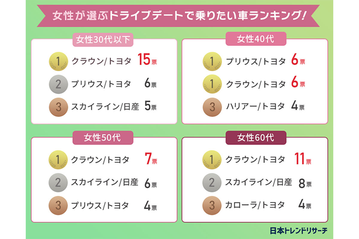 年代別にみると、30代・50代・60代は「クラウン/トヨタ」、40代は「プリウス/トヨタ」が1位となり、クラウンが幅広い年代で支持されていることがわかった。
