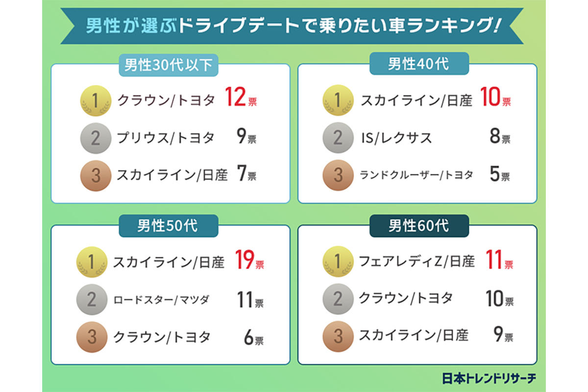 年代別でみると30代以下は「クラウン/トヨタ」、40代・50代は「スカイライン/日産」、60代は「フェアレディZ/日産」が1位にランクインしている。