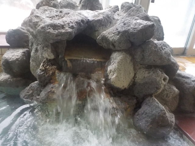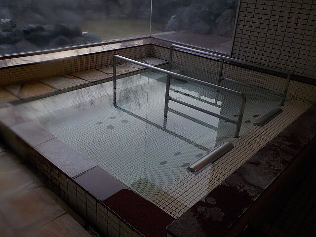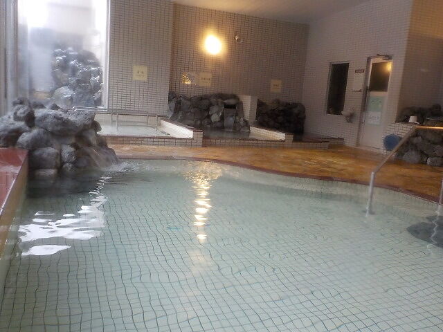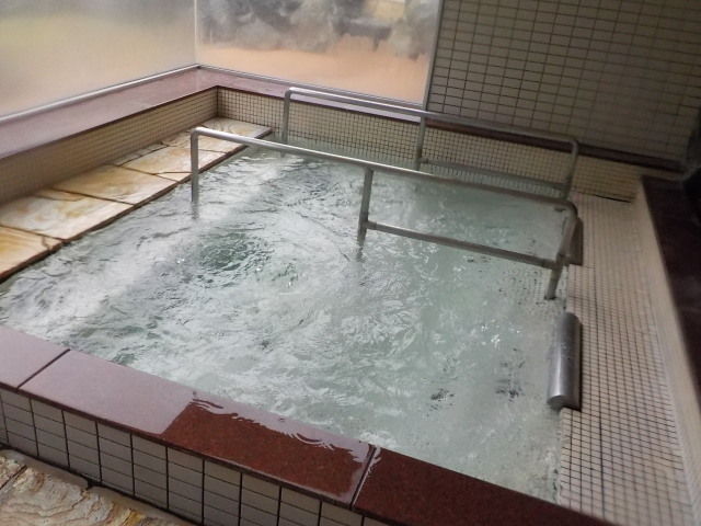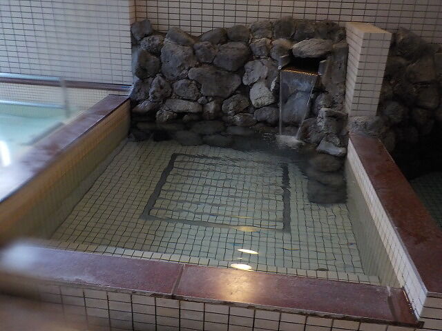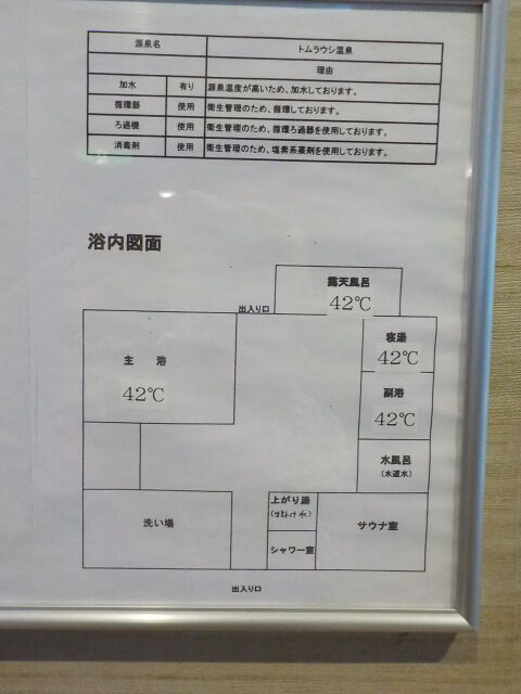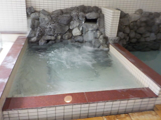 バイブラ稼働は休止になって、不感の湯の表示になっている。トムラウシ温泉使用。知覚的には、微弱硫化水素臭味。側壁の循環吸込み口から湯が吸い込まれている。