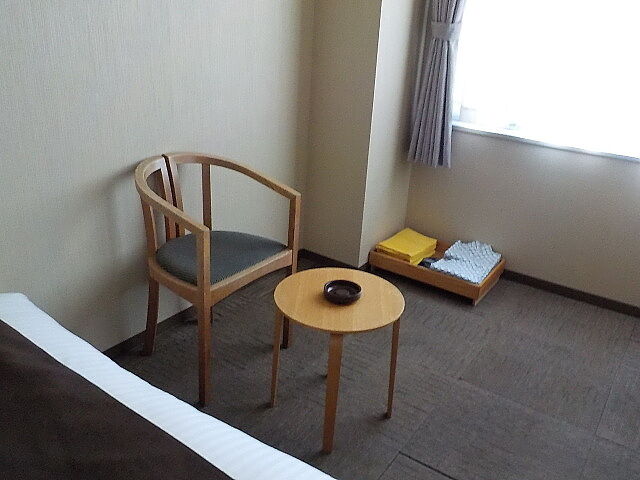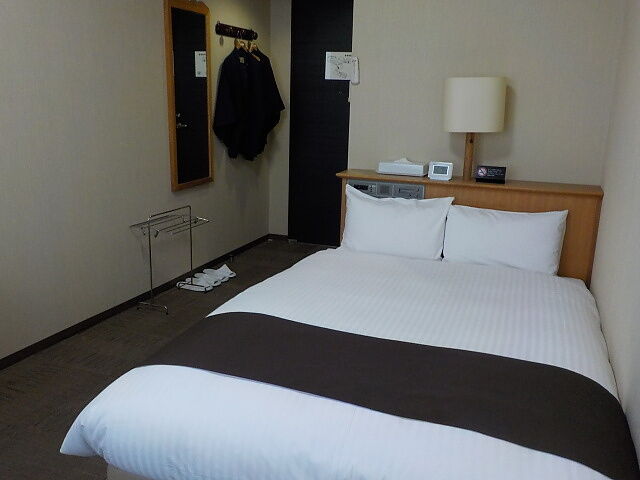 案内されたのはダブルベッド喫煙室。フリーWi-Fi利用可(電波弱い)。