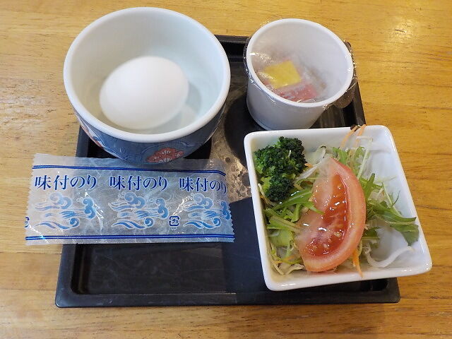 トッピングコーナーより。サラダ、海苔、納豆、卵。