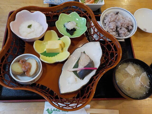 朝食は和食膳。焼き魚、とろろ、イカの山わさび和え、さやあかね塩辛添え、豚汁、黒千石大豆炊き