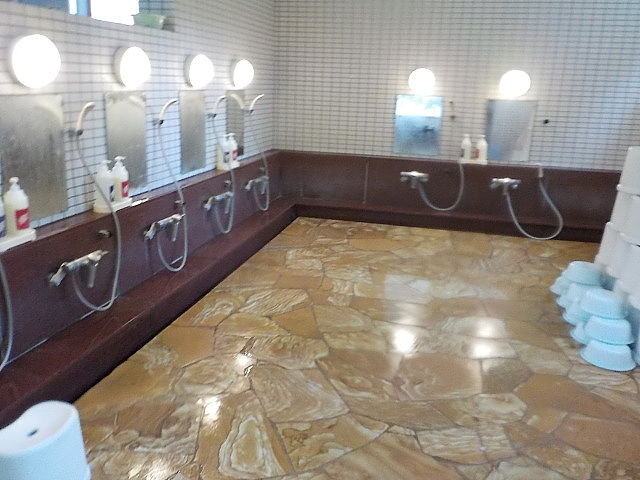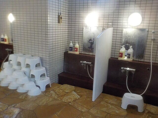 打たせ湯は稼働していない。洗い場に仕切り板設置。