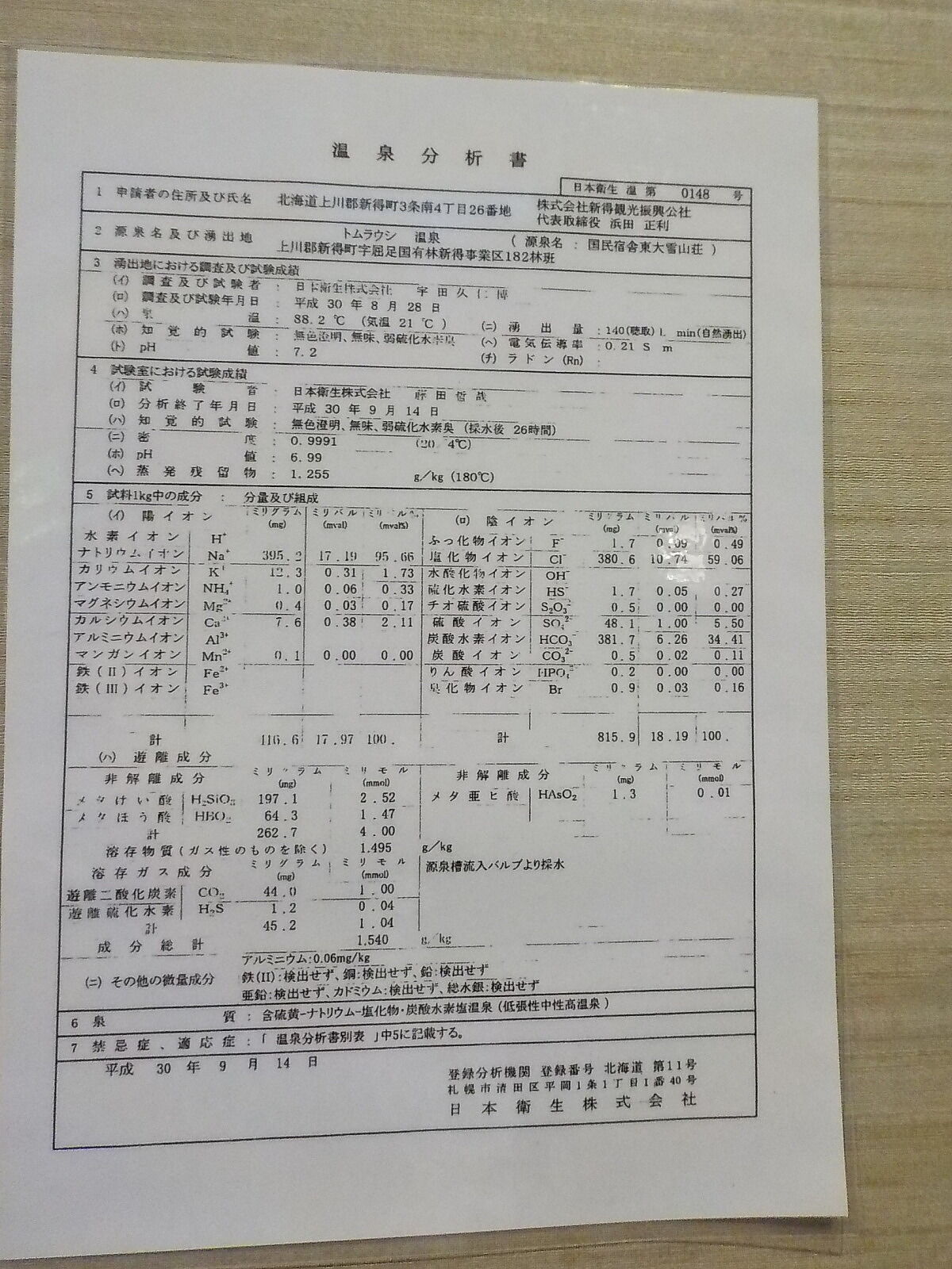 ◇温泉分析書(トムラウシ温泉)(脱衣所掲示)