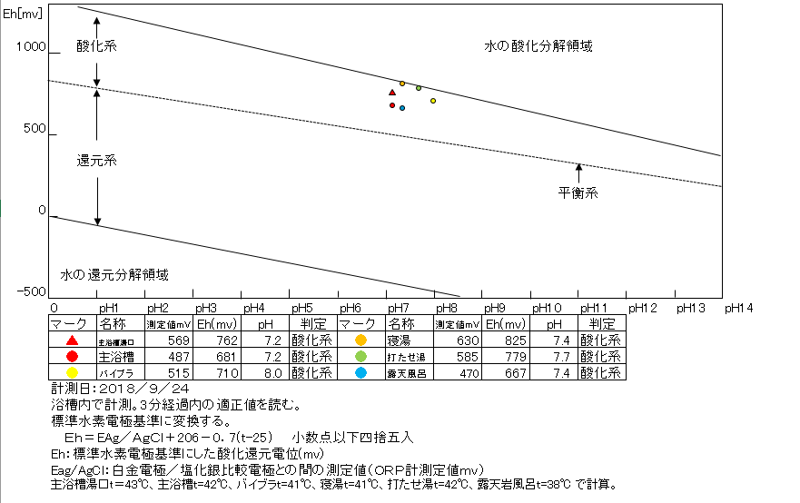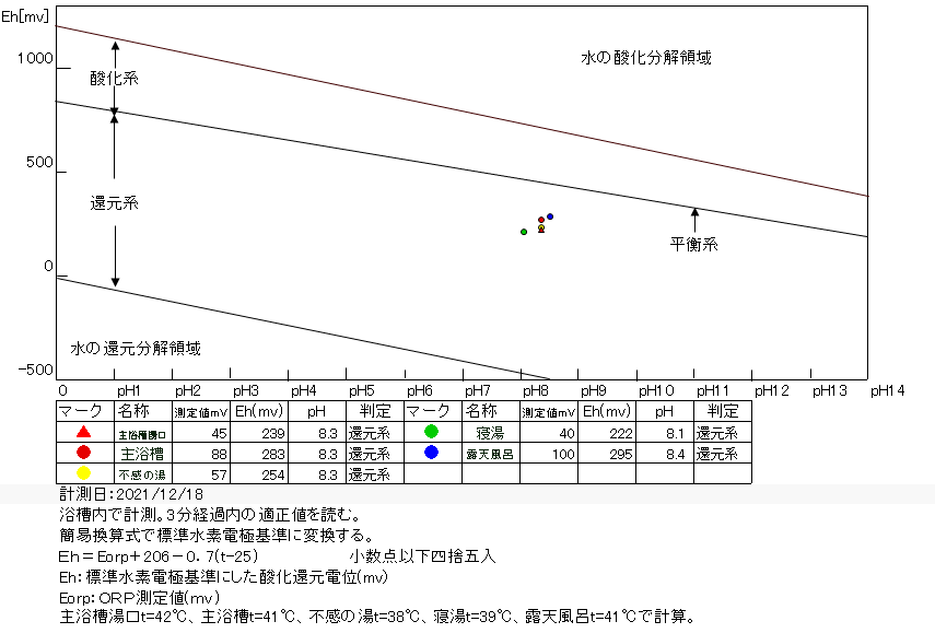 いずれも還元系にあり、温泉の鮮度は良好である。入湯時、塩素系薬剤を控えている可能性がある。