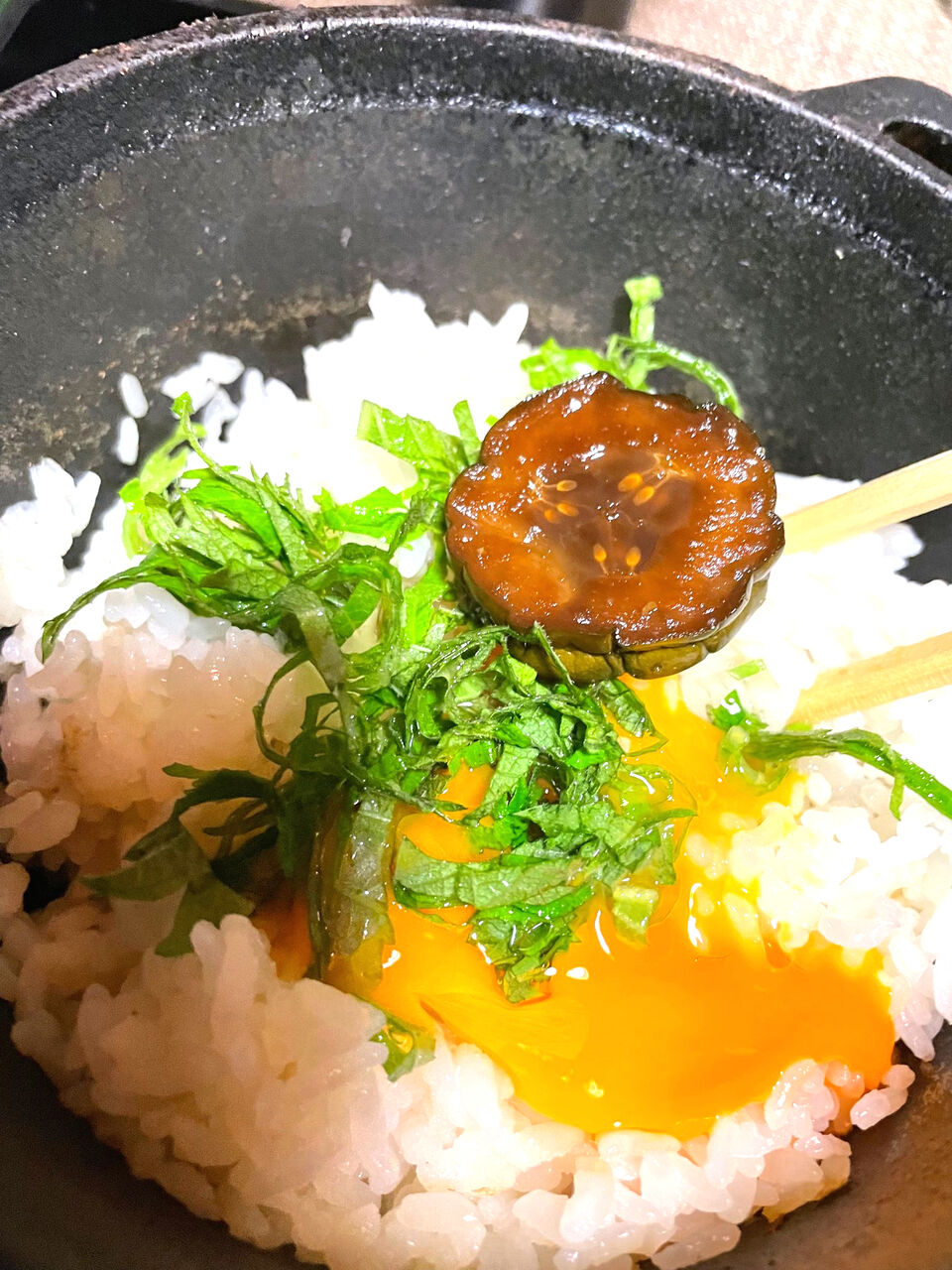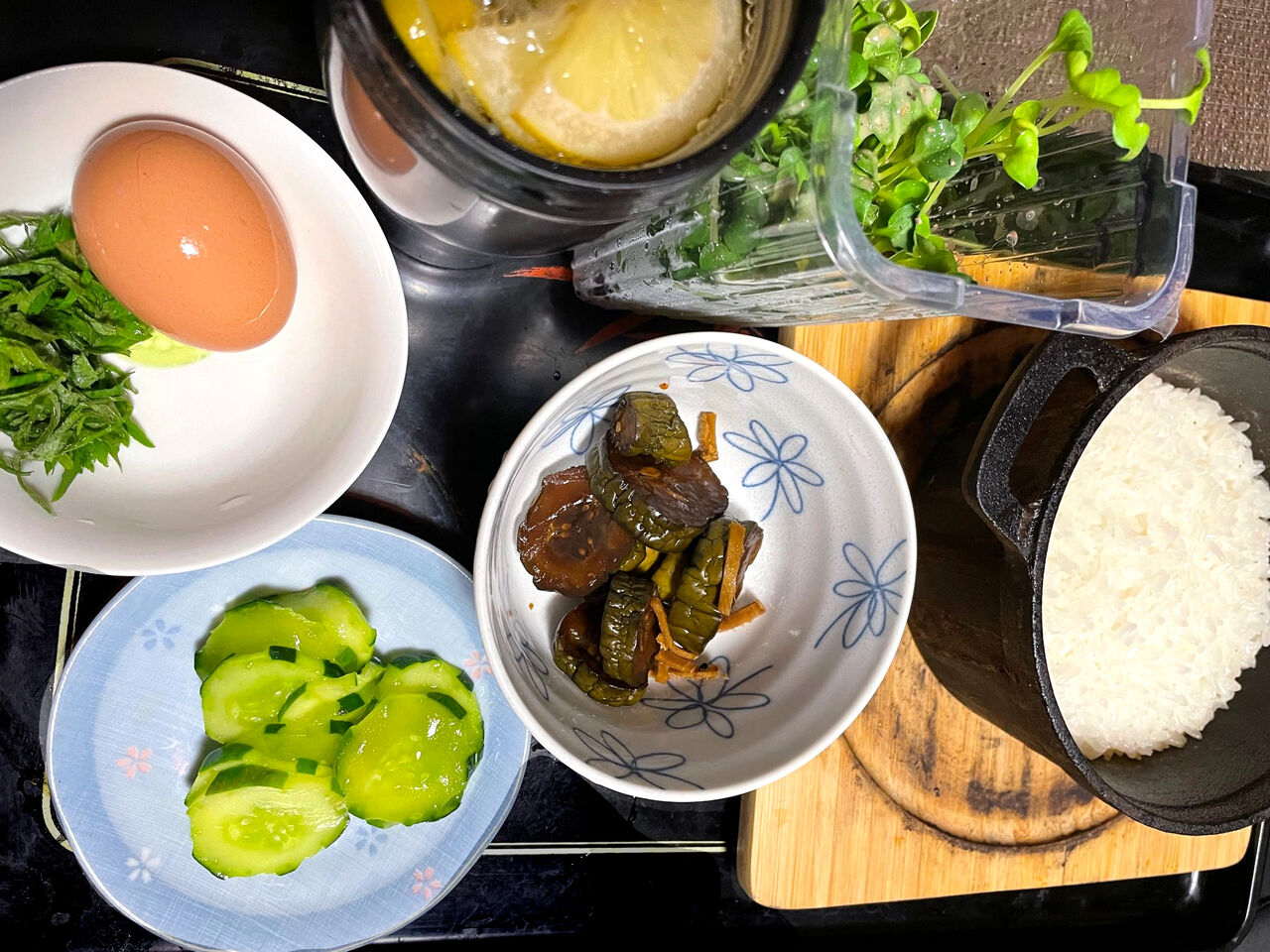 生卵、大葉、キュウリのからし漬け。