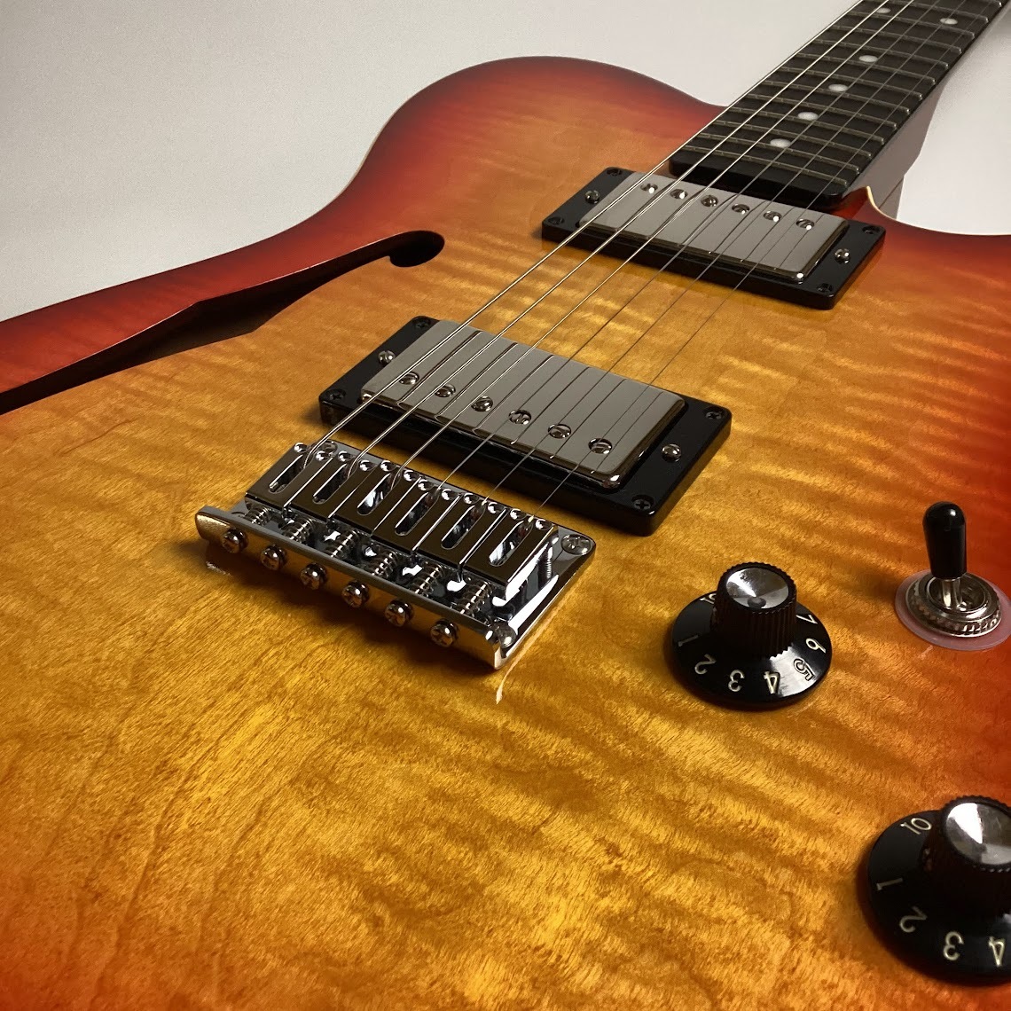 一般的なフェンダータイプとは異なったウッドスペックをチョイスしており、その豊かな箱鳴りはまるでESモデルの様なファットなトーンを生み出しております。