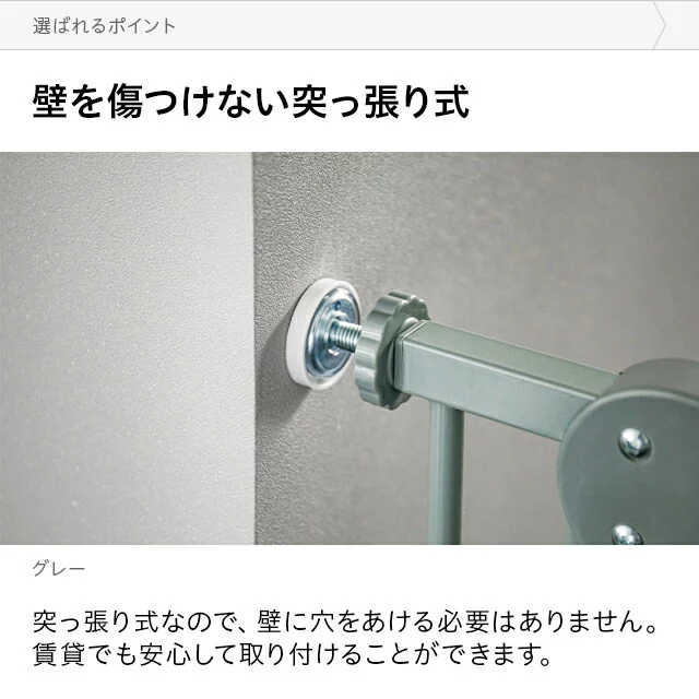 キズやズレを防ぐ保護キャップ付き 壁へのキズやゲートのズレを防ぐ保護キャップ付き。突っ張りの先端に固定すれば、より安全に使えます。 壁面保護シール付き 壁面に貼り付け可能な保護シールも付属。キズやゲートのズレをさらに軽減することができます。