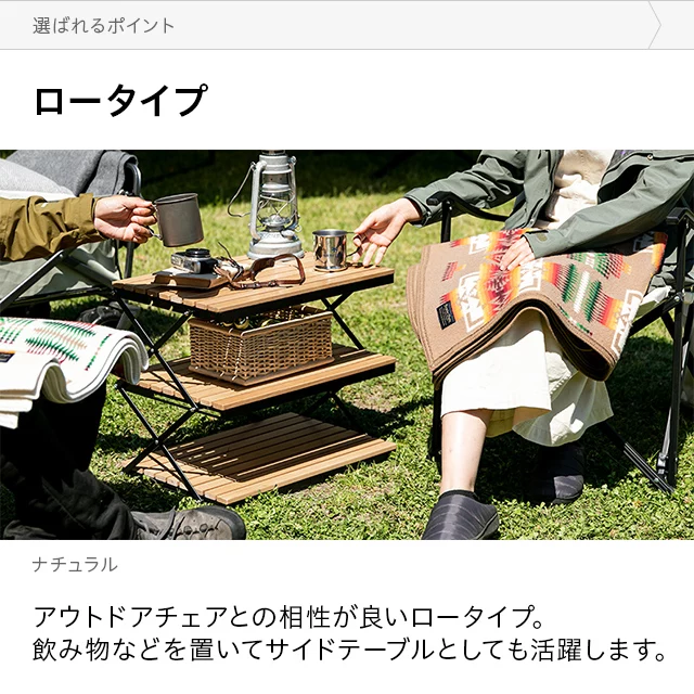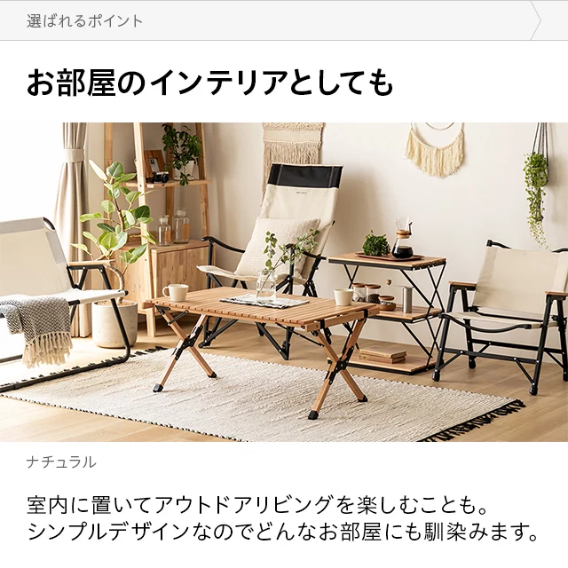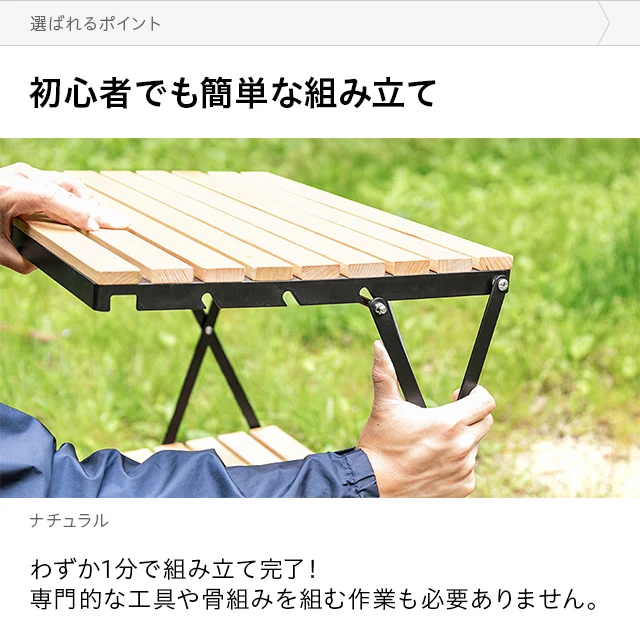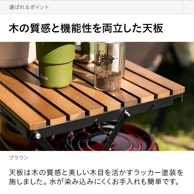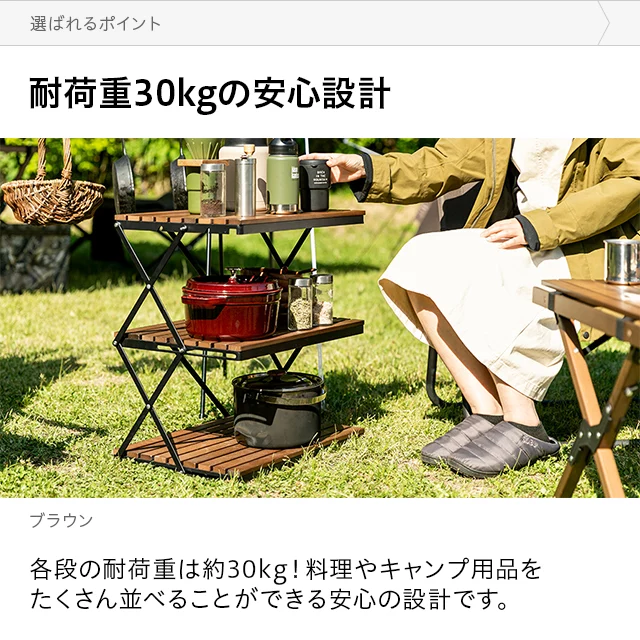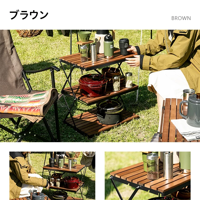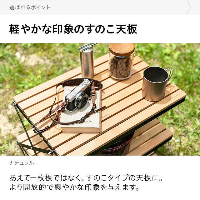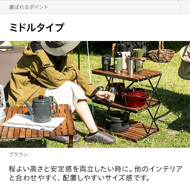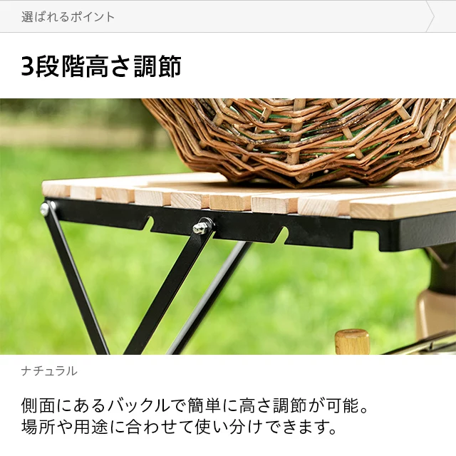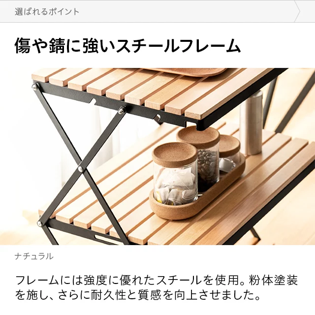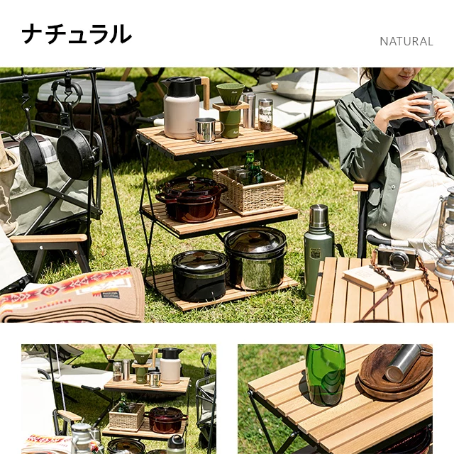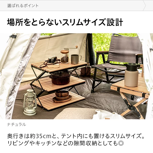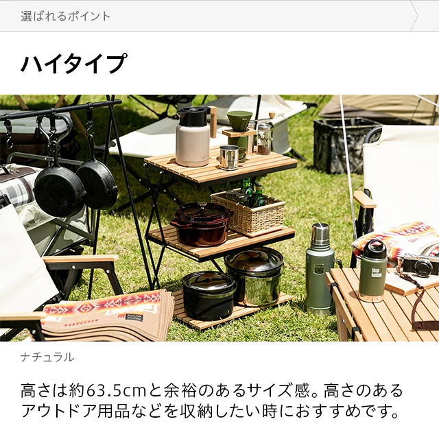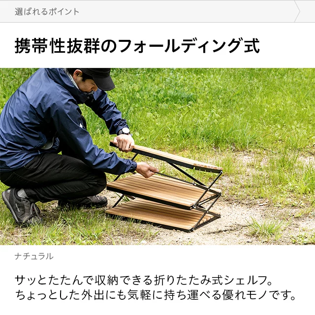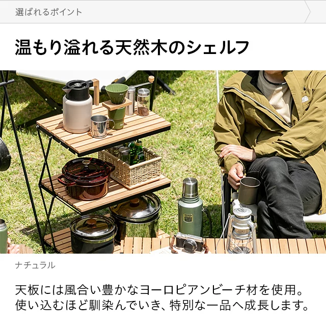 自然を感じる癒しのシェルフ 味わい深い無垢材の天板が気分を高めるウッドシェルフ。サッとたたんで簡単に持ち運びができ、気軽にアウトドアを楽しめます。 ヨーロピアンビーチ材 すのこ天板 折りたたみ式 コンパクト収納 高さ調整 簡単組立
