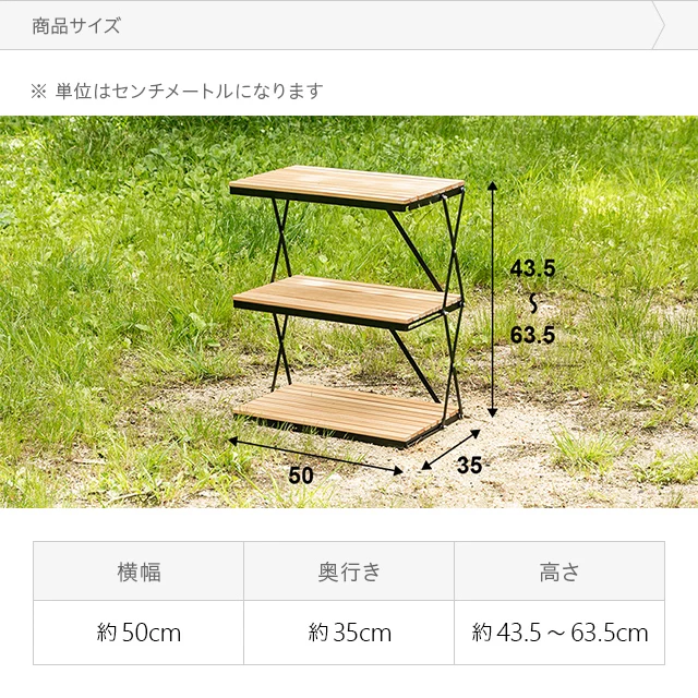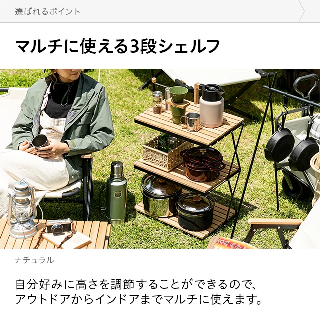 マルチに使える3段シェルフ 自分好みに高さを調節することで、アウトドアからインドアまでマルチに使えます。 シェルフとしてアウトドア用品を置いたり、お部屋をスッキリ見せるオープン収納としても。 <前へ 次へ>