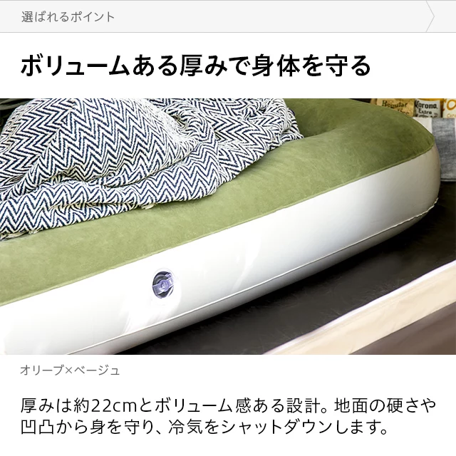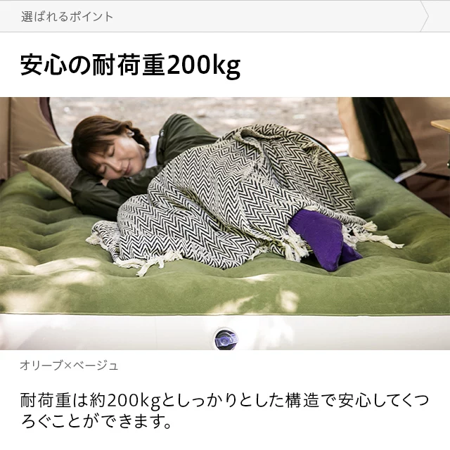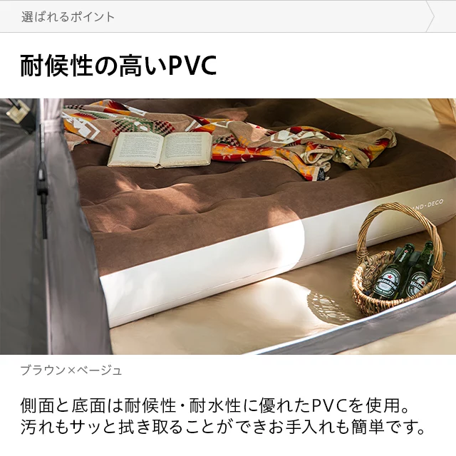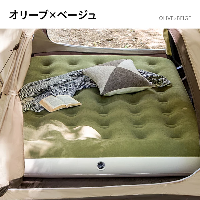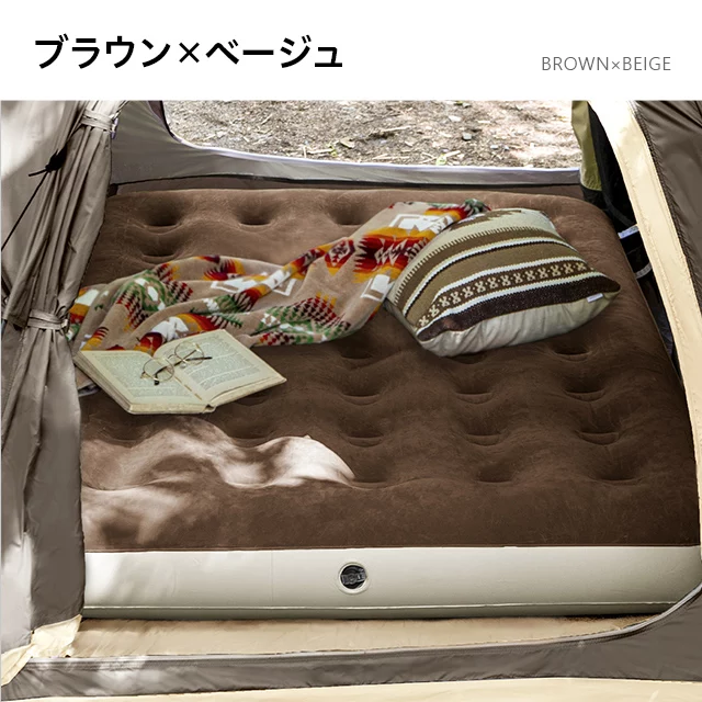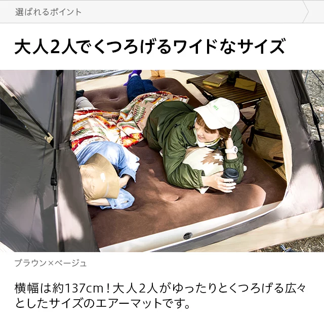 こちらはAND・DECO ベロア調エアーマット Dのページです ダブルサイズで広々、寝心地の良いエアーマット空気を入れるだけで、アウトドアでも快適な寝床を作れるエアーマット。ダブルサイズのマットは大人2人寝転がってもゆったりとくつろげます。肌触りが心地良いベロア調生地を使用しており、キャンプや車中泊でもストレスフリーな睡眠へと導きます。