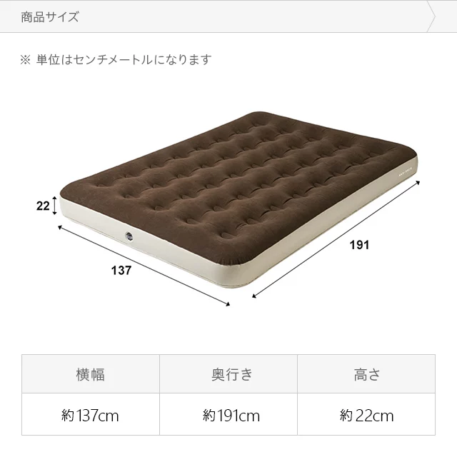 商品サイズ ※単位は「ミリメートル」になります <前へ次へ> 本体 横幅奥行き厚さ 137cm191cm22cm ※膨らまし方により多少の誤差があります。 電動ポンプ 横幅奥行き高さ 135㎜105㎜100㎜