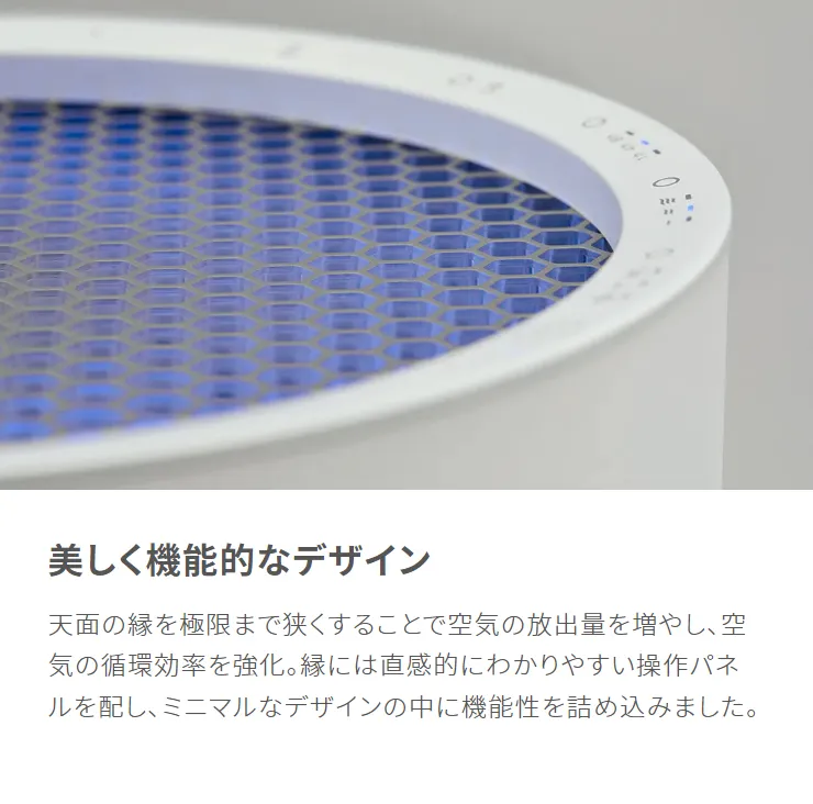 天面の縁を極限まで狭くすることで空気の放出量を増やし、空気の循環効率を強化。縁には直感的にわかりやすい操作パネルを配し、ミニマルなデザインの中に機能性を詰め込みました。