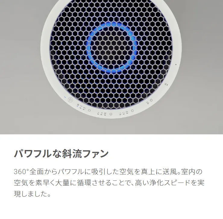 360°全面からパワフルに吸引した空気を真上に送風。室内の空気を素早く大量に循環させることで、高い浄化スピードを実現しました。