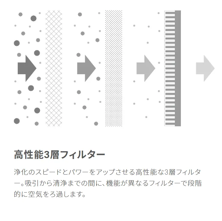 浄化のスピードとパワーをアップさせる高性能な3層フィルター。吸引から清浄までの間に、機能が異なるフィルターで段階的に空気をろ過します。
