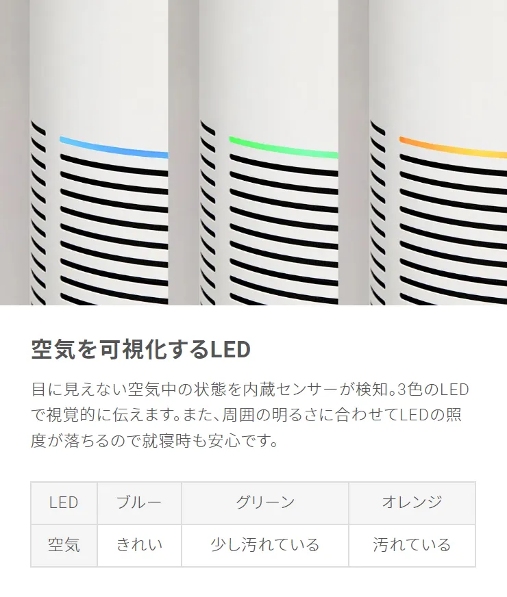 目に見えない空気中の状態を内蔵センサーが検知。3色のLEDで視覚的に伝えます。また、周囲の明るさに合わせてLEDの照度が落ちるので就寝時も安心です。