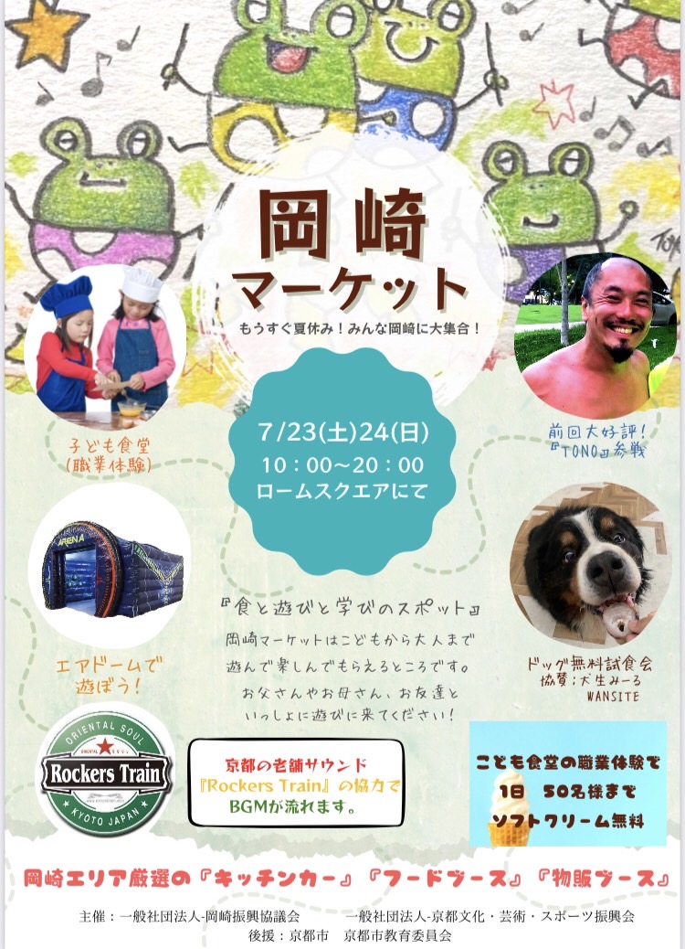 7月の土・日・祝日の10時から20時まで、平安神宮斜向かい・岡崎公園の西に隣接する、ロームシアター京都内ロームスクエアでイベント「岡崎マーケット」を開催します。