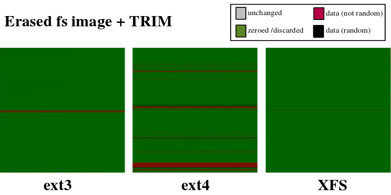 It is clearly visible that TRIM did its job. Discarded areas depend on filesystem type (other filesystems on test system did not supported TRIM unfortunately).