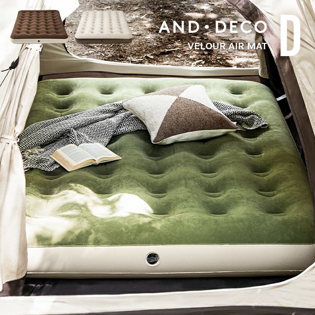 こちらはAND・DECO ベロア調エアーマット Dのページです ダブルサイズで広々、寝心地の良いエアーマット空気を入れるだけで、アウトドアでも快適な寝床を作れるエアーマット。ダブルサイズのマットは大人2人寝転がってもゆったりとくつろげます。肌触りが心地良いベロア調生地を使用しており、キャンプや車中泊でもストレスフリーな睡眠へと導きます。