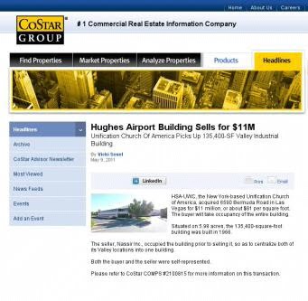 アメリカの統一協会(統一教会)がラスベガスのヒューズ・エアポート・ビルを1100万ドル(約8億9千万円)で購入したと、今月9日米国不動産業界向けサービスのリーディングプロバイダーであるCoStar Group, Inc.が伝えている。