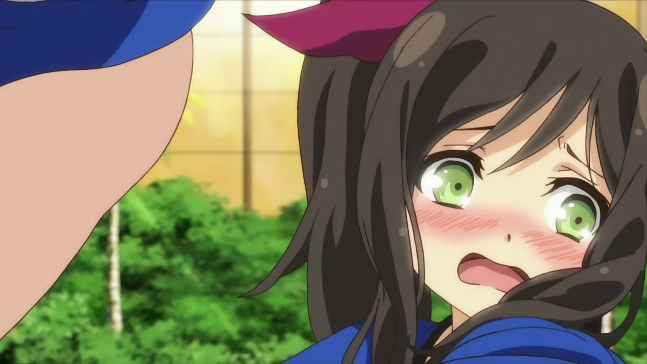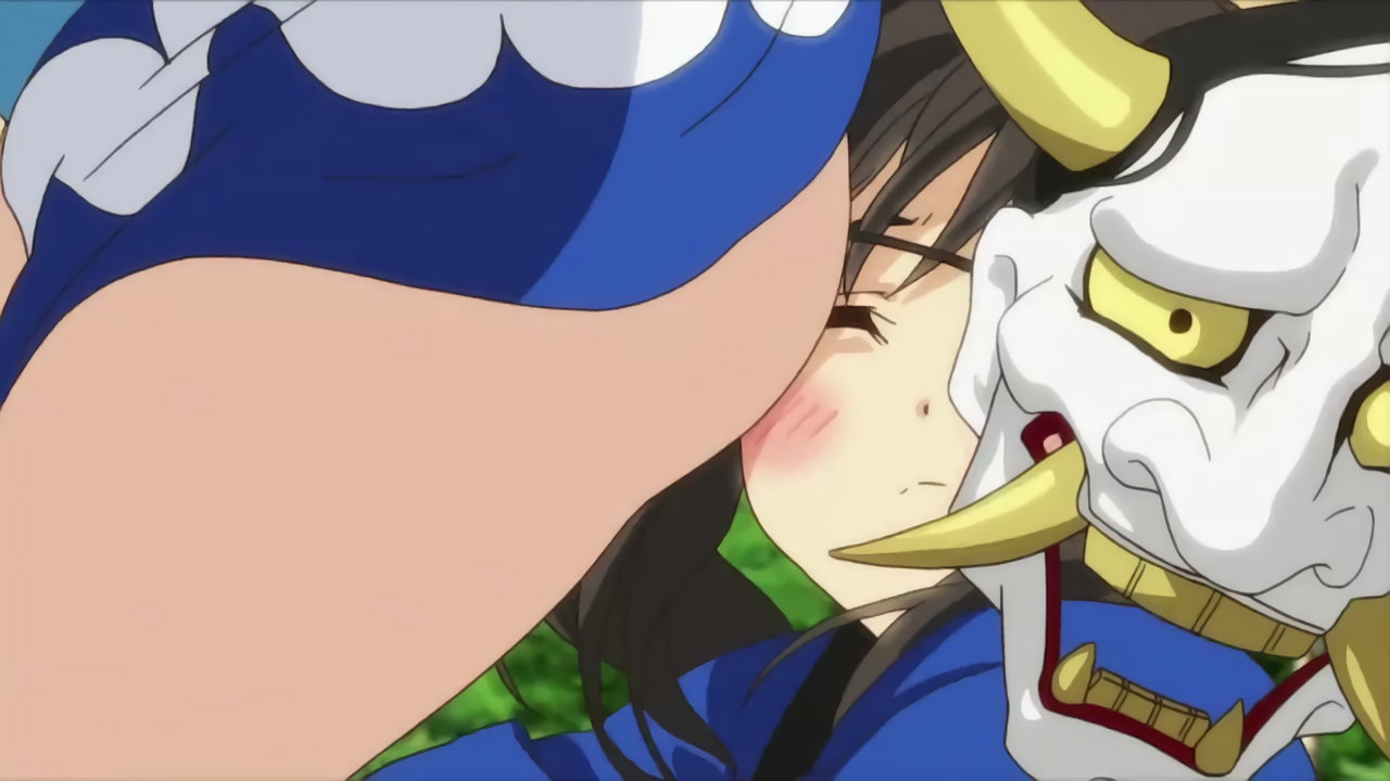 仮面が外れ、羞恥赤面する叢。慌てて法被を脱ぎ、顔を隠そうとする。