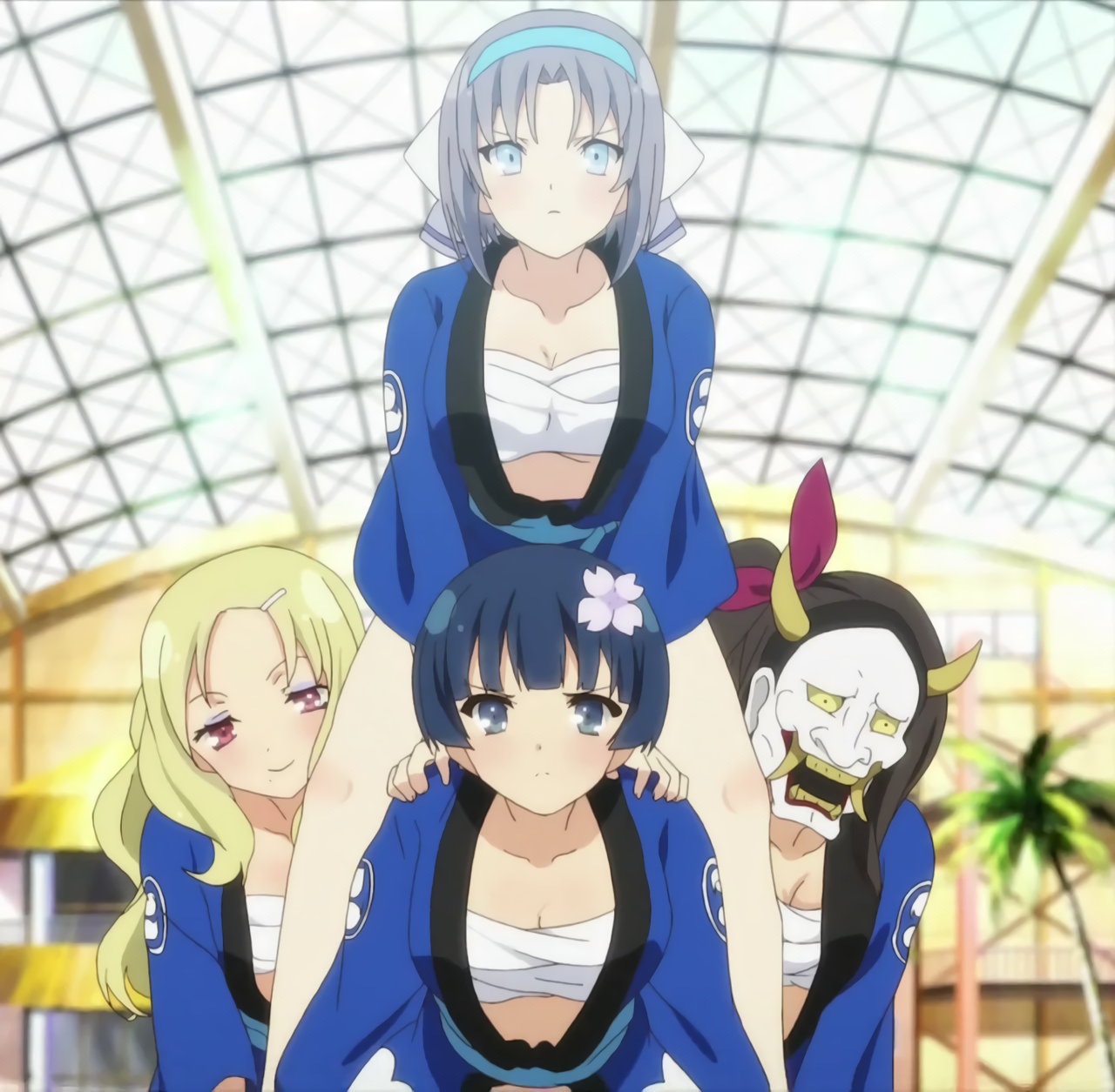 褌に法被姿となり、騎馬戦に臨む忍者娘たち。なお、詠が食べ過ぎで動けないため、焔たちは参加できず。