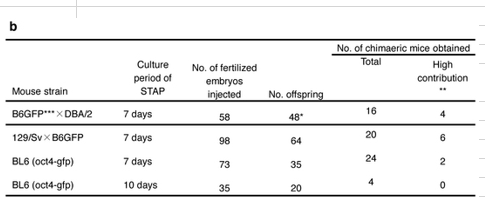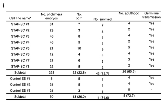 この表は三誌論文にはありませんよ。なぜならこれは若山さんの幹細胞化の実験で、三誌リジェクトされた後に、ネイチャー誌に、この幹細胞化実験結果とともに二報同時再提出しようと提案されて小保方さんに渡されたデータなのです。小保方さんはこのデータを渡されるまでこの結果は知っていません。