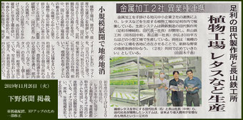 金属加工を手掛ける地元中小企業2社の連携により、レタスなどを生産する植物工場が足利市内で稼働している。生産システムは、田代製作所が開発し、長山鉄工所が広さ100平方メートルほどの小型工場で生産している。