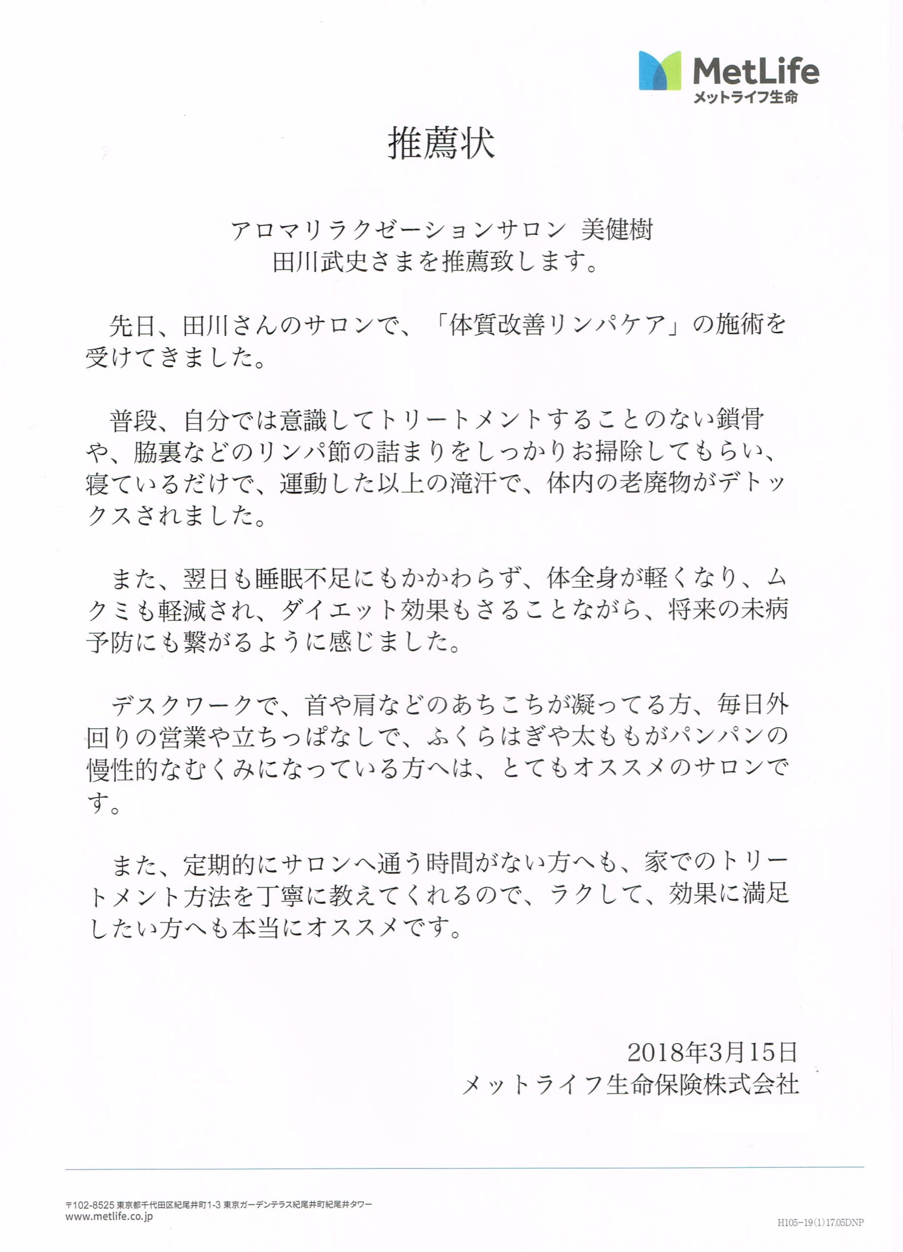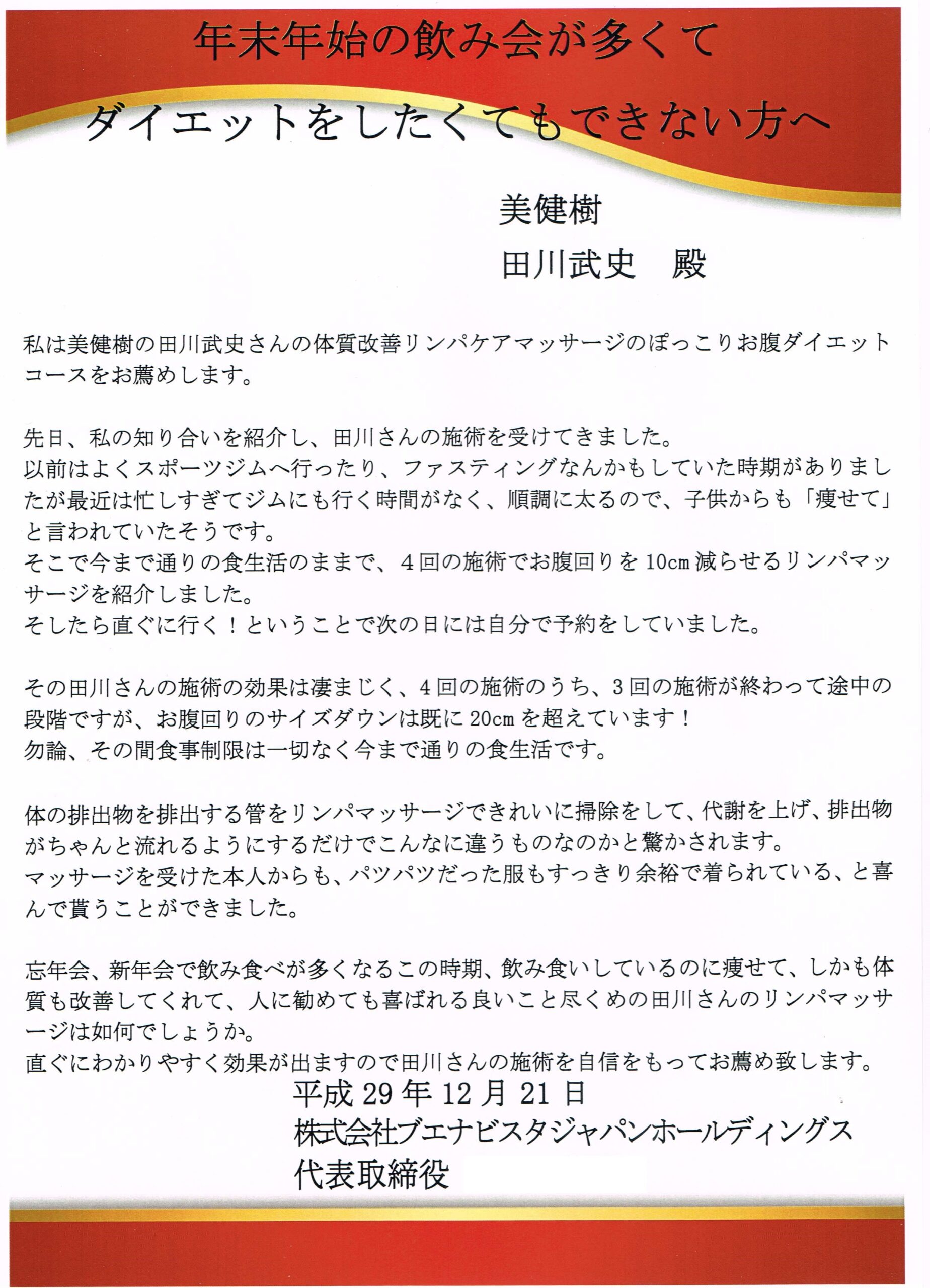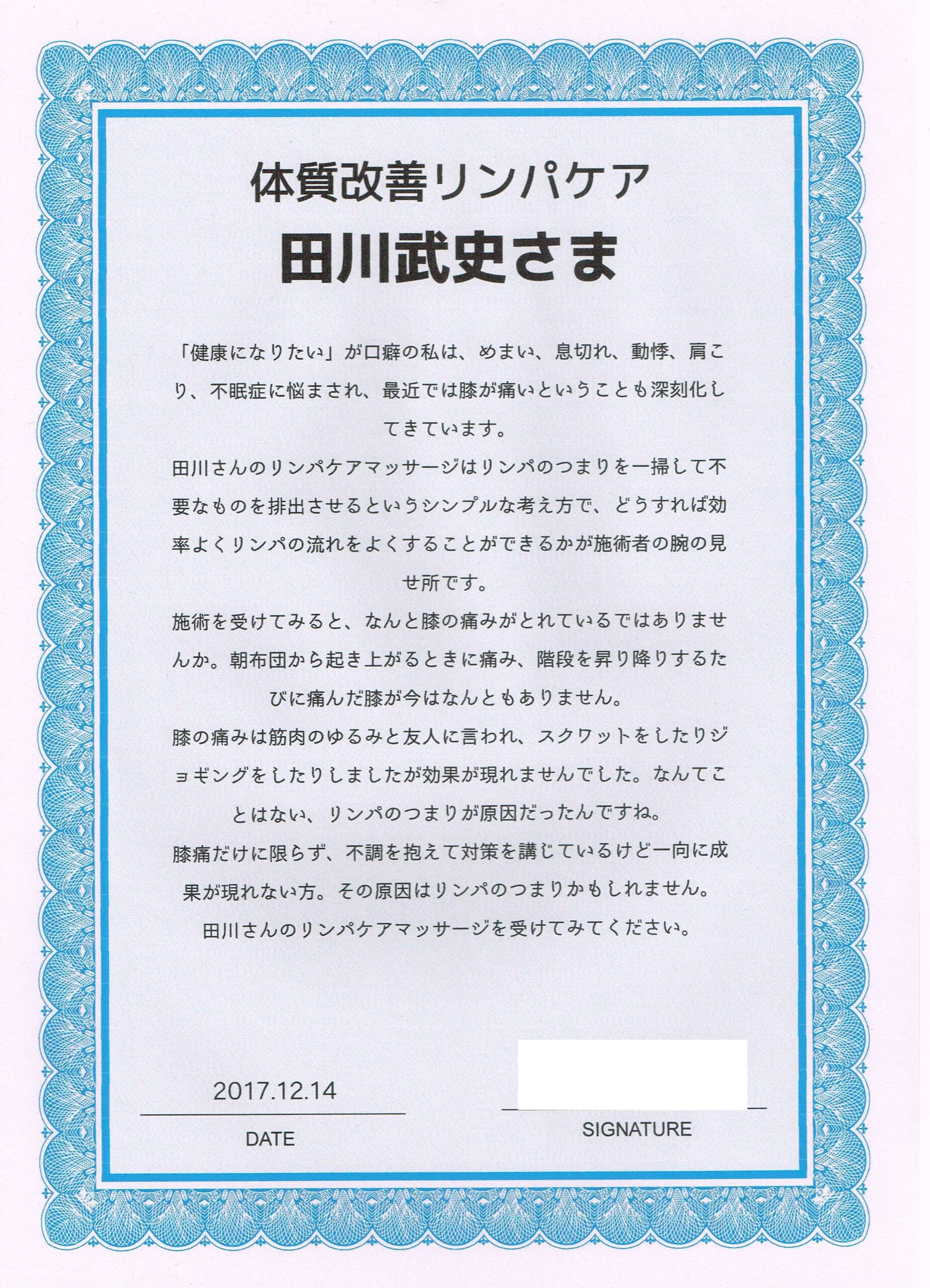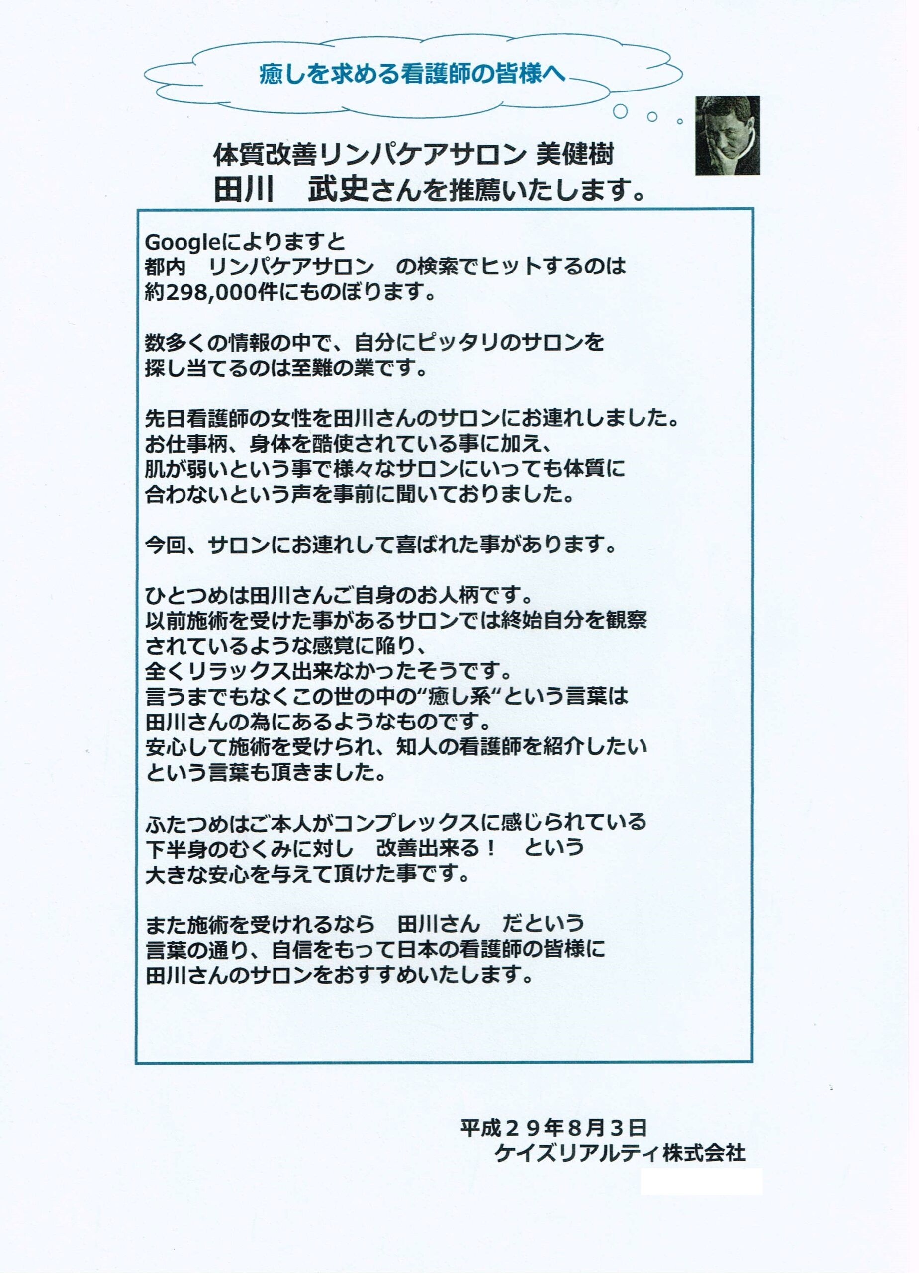 田川さんの施術を自信を持ってお薦め致します。