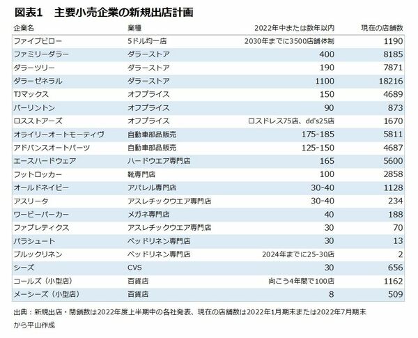 図表1は年内または数年以内の大手小売企業の出店計画一覧だ(2022年8月15日時点)。