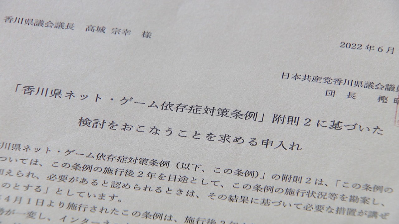 香川県のネット・ゲーム依存症対策条例の施行から2年が経ったのに合わせ、共産党県議団が6月17日、議会で検討委員会を設置するなどして施行状況などを検討するよう議長に申し入れていました。