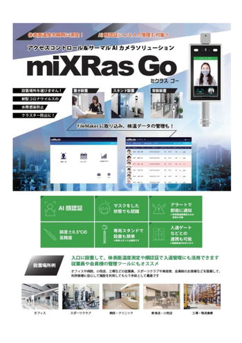 サーマルAIカメラは、瞬時に検温、マスク有り無しチェック、顔認証が出来ます。カメラ単体でも運用出来ますが、データベース「miXRas Go」と連動させる事で、PCやiPadで検温データを分析、活用が出来ます。