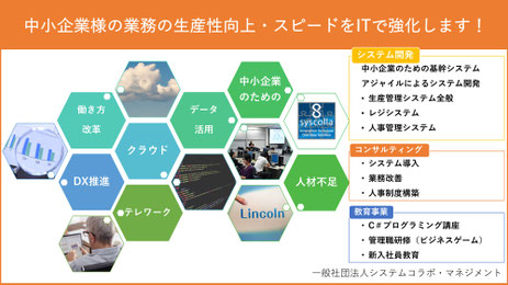 中小企業様のDXを推進するためのコンサルティング・システム開発・導入を行います。カスタマイズ可能な基幹システムの導入(生産管理システム・レジシステム・人事管理システム)など業務のIT化をサポートいたします。
