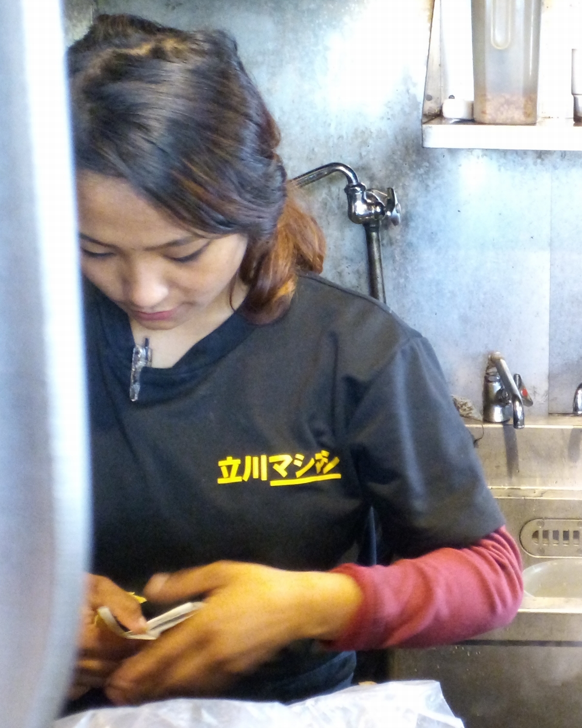 とても熱心にお仕事をしております。お仕事に集中している隙を狙って、あの「立川マシマシ」って文字が書いてあるあたりを、揉みっ、としてあげたいですね(*´Д`)