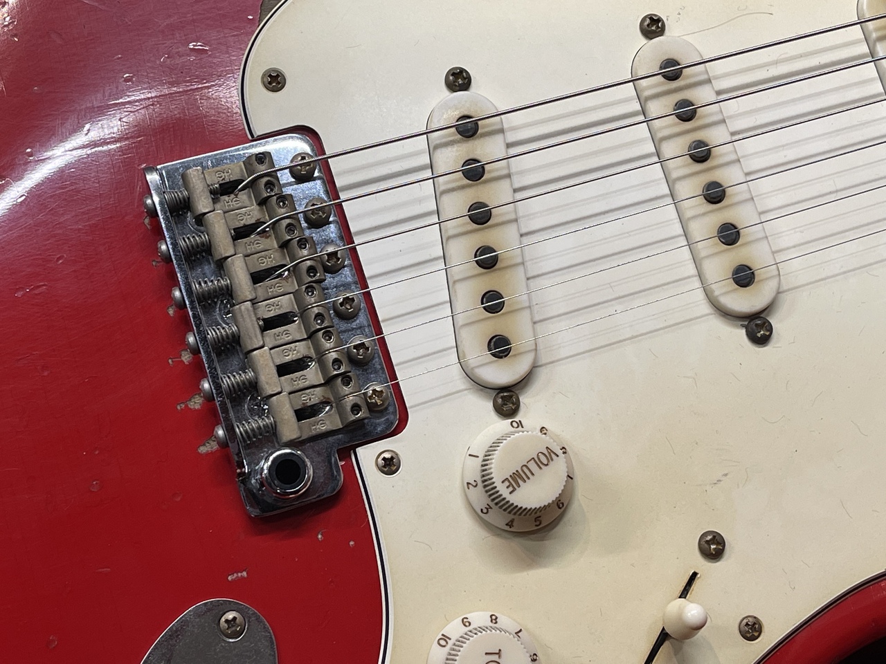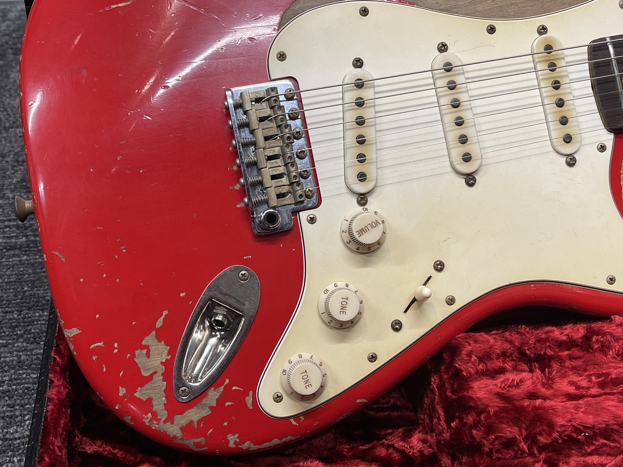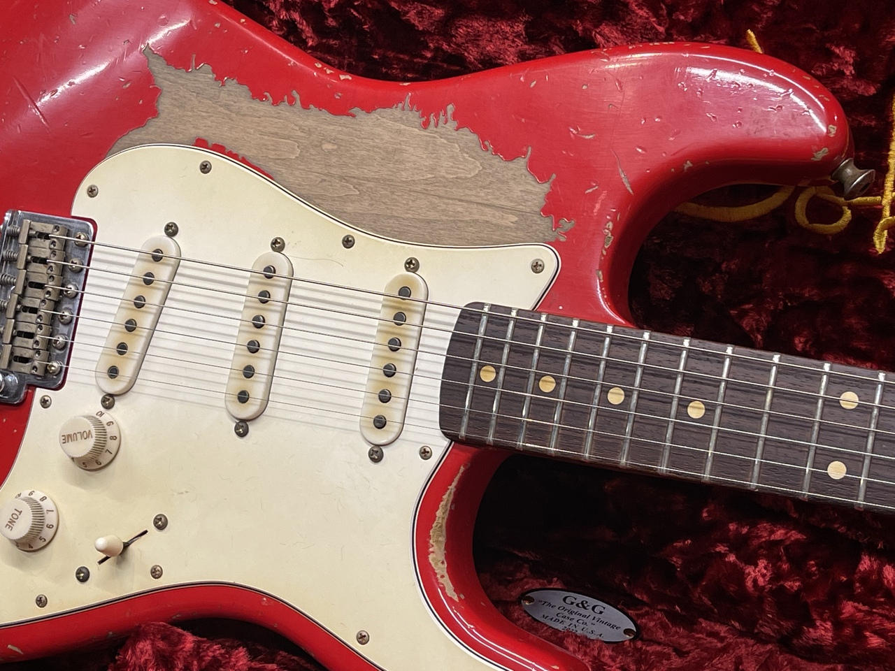 全体的に激しく塗装が剥がされた上に汚しの加工を自然に施しているので、長年弾き倒されて来た様な貫録を持つ唯一無二のルックスにを持っております。