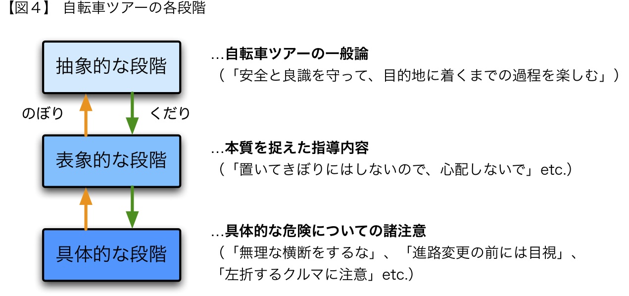 前節までで、具体的な段階から表象段階までの「のぼり」の過程を追ってきました。ここに加えて言うならば、この表象段階の理解というのは、「安全と良識を守って、目的地に着くまでの過程をこそ楽しむものである」という抽象段階の、自転車の旅一般論が指し示しているところも守られている、ということがわかってもらえるのではないかと思います。さきほどとは逆に、「くだり」の向きの理解というわけです。