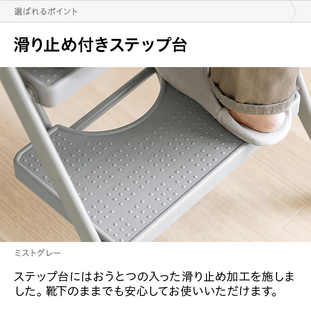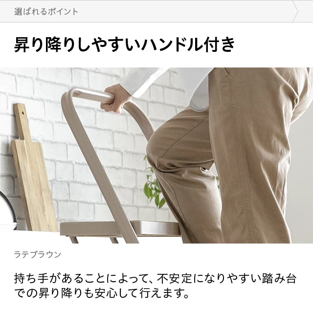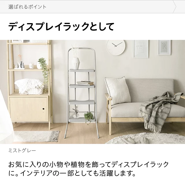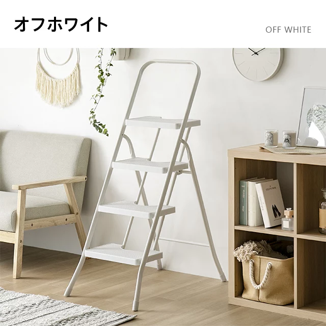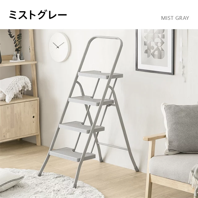 こちらは折り畳み踏み台4段タイプのページです あらゆるシーンに対応する、折りたたみステップ 高いところのお掃除や物の出し入れなど、さまざまなシーンで活躍するステップスツール。奥行きのあるステップや上部のハンドルなど、安全性にも優れています。優しい色合いとデザインでインテリアになじみやすく、身近に置いて便利に使える一台です。