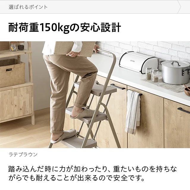 耐荷重150㎏の安心設計 踏み込んだ時に力が加わったり、重たいものを持ちながらでも耐えることが出来るので安全です。 耐荷重約150㎏ 耐荷重に関する試験を実施しました 力を加えて耐荷重を測定する試験を検査機関にて実施。同価格帯最高クラスの耐荷重を実証しました。 試験内容試験結果 150kgの力を静かに加え、24時間経過後に破損が無いことを確認 異常なし